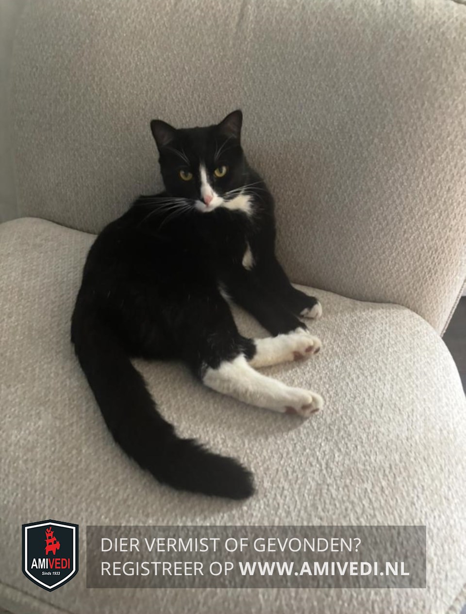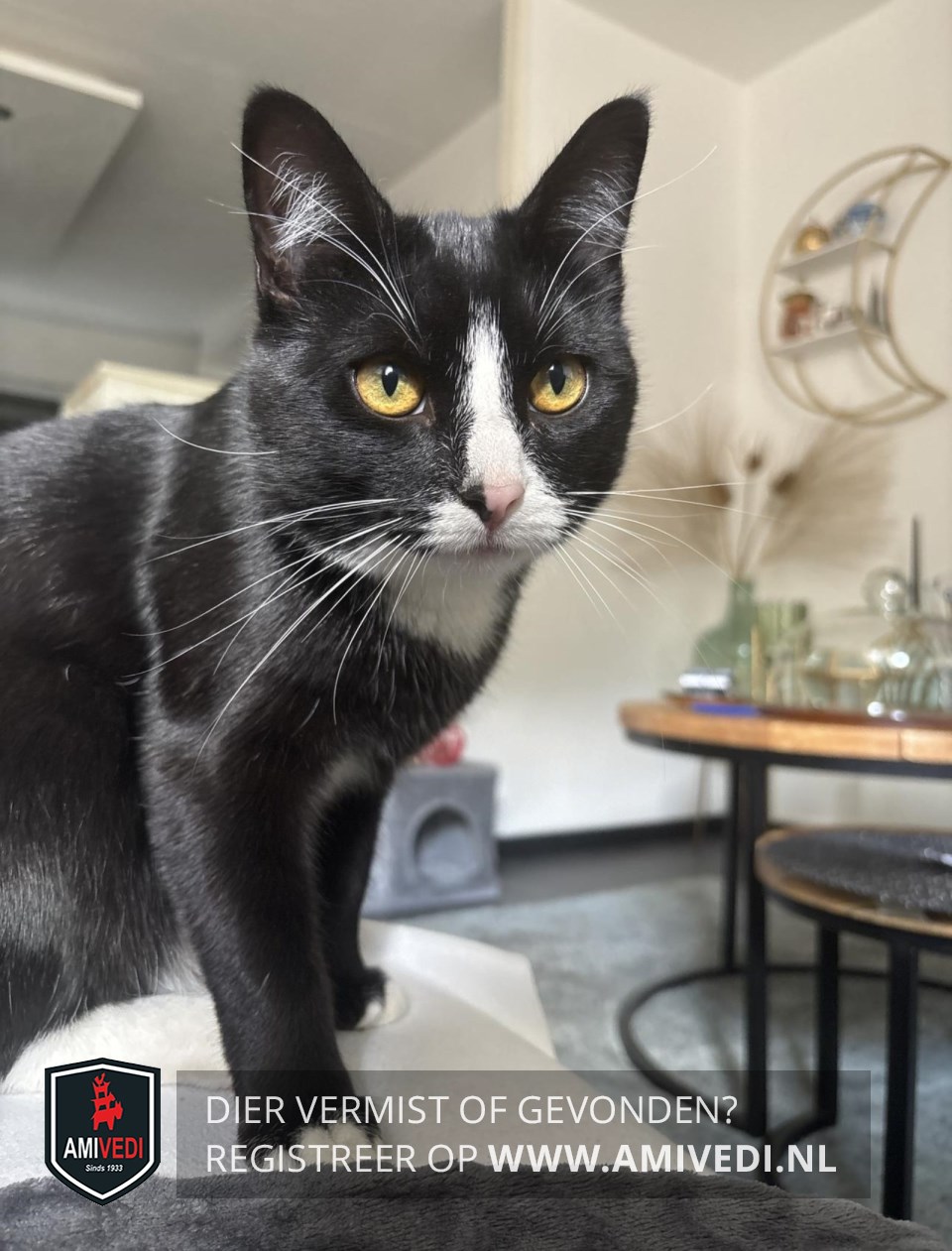 | Signalement | Overwegend zwart met witte accenten: witte haren in de oren, witte snorharen, witte neusbrug, wit vlakje links en rechts van de (roze met een beetje zwarte) neus, kin, bef; witte teentjes aan de voorpoten, witte laarsjes aan de achterpoten; gele ogen |