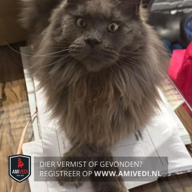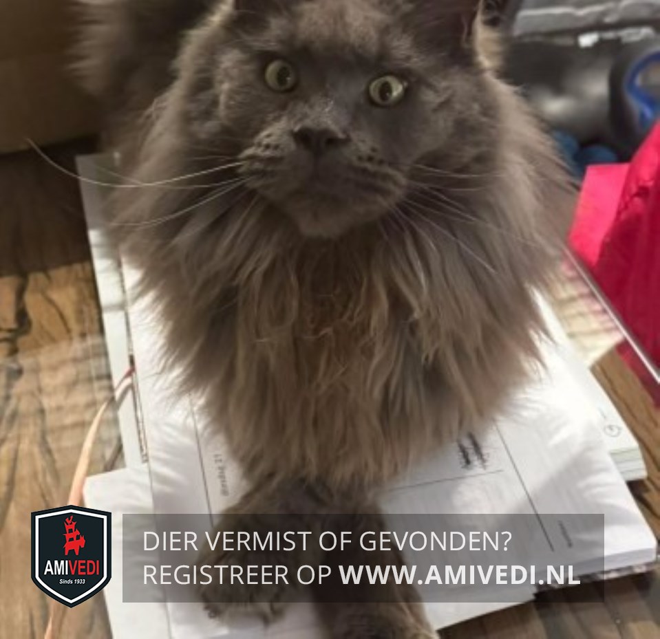 | Signalement | Groote Grijs Maine Coon met lange haar en groene ogen |