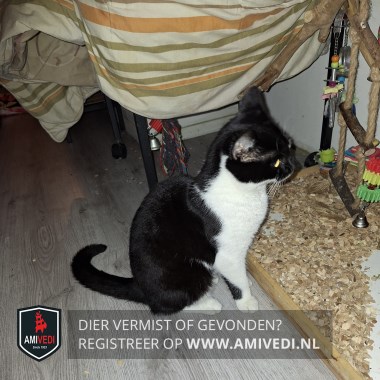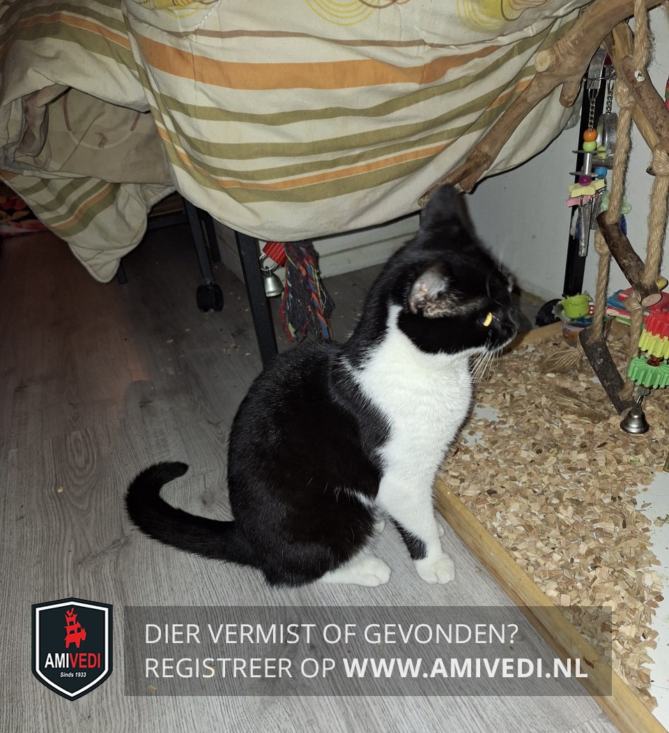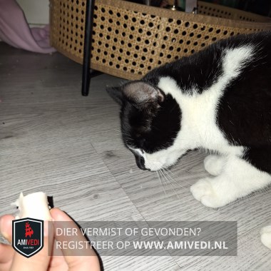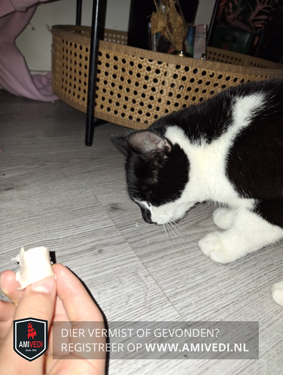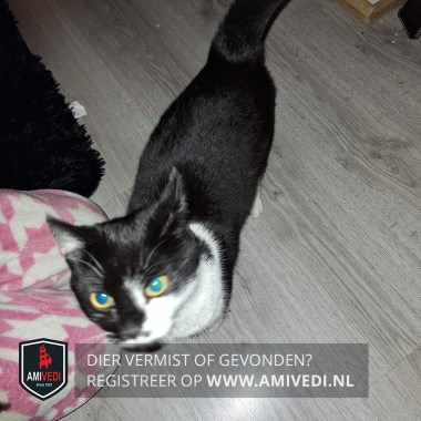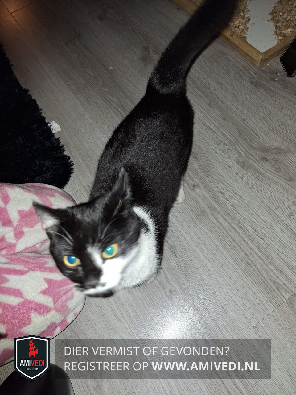 | Signalement | Zwart-witte kat: witte linkerwang, stukje neusbrug bij het linkeroog is ook wit; zwart neusje, witte 'lippen', kin, bef, borst, linkervoorpoot, rechtervoorpoot (met klein zwart vlakje aan de achterkant halverwege), witte laars aan de rechterachterpoot, sok aan de linkerachterpoot |