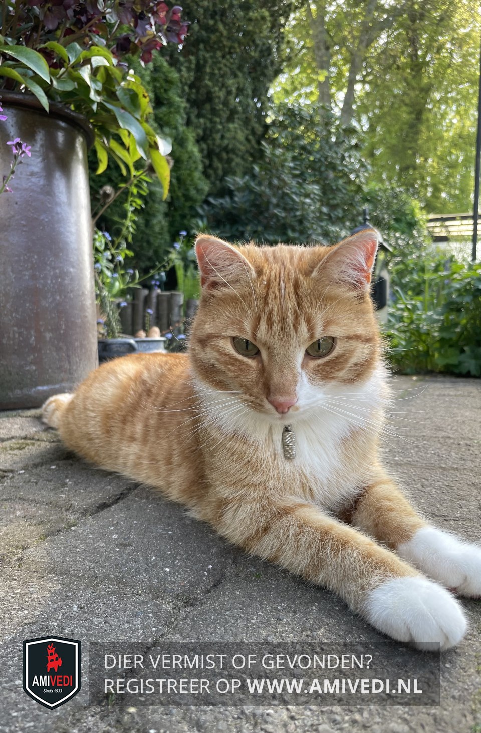 | Signalement | Rood cypers gestreept met wit. Linkerkant bovenlip wit, loopt door langs neusbrug naar oog. Links naast neuspunt klein oranje stipje. Witte onderkaken, witte keel, witte bef. Wit tussen voorpoten. Voorpoten witte sokjes. Staart rood/wit geringd. Niet groot. |