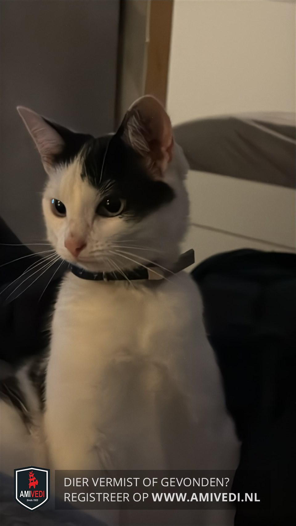| Signalement | Wit, zwart bij het rechter en linker oor, zwart boven het linker oog wat door gaat tot de zijkant van het oog, op de rechter zijkant een zwart vlek in de vorm van een soort hartje. |