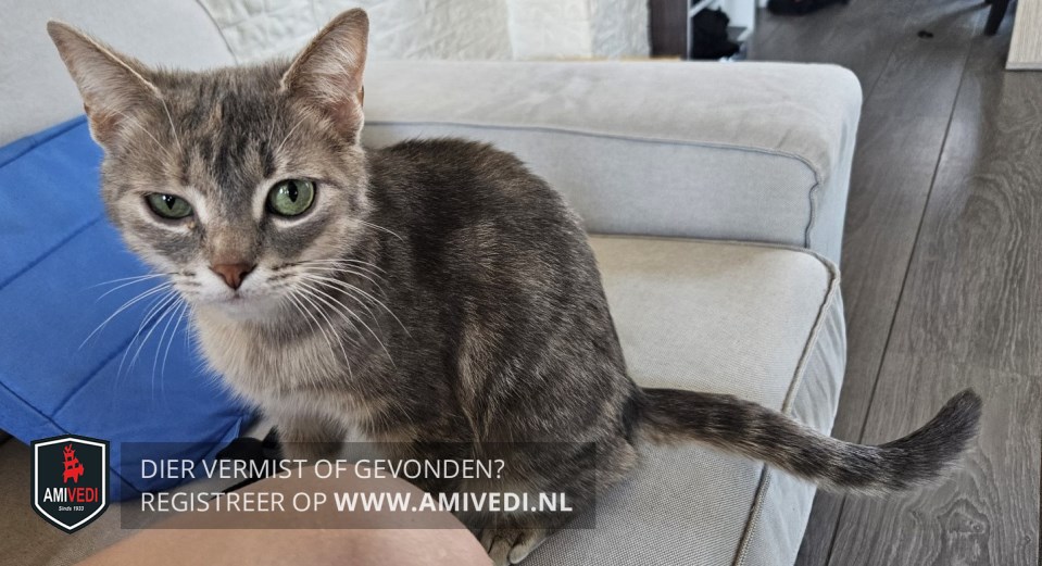 | Signalement | Beige/grijs, cypers gestreepte staart, witte kin, borst. |