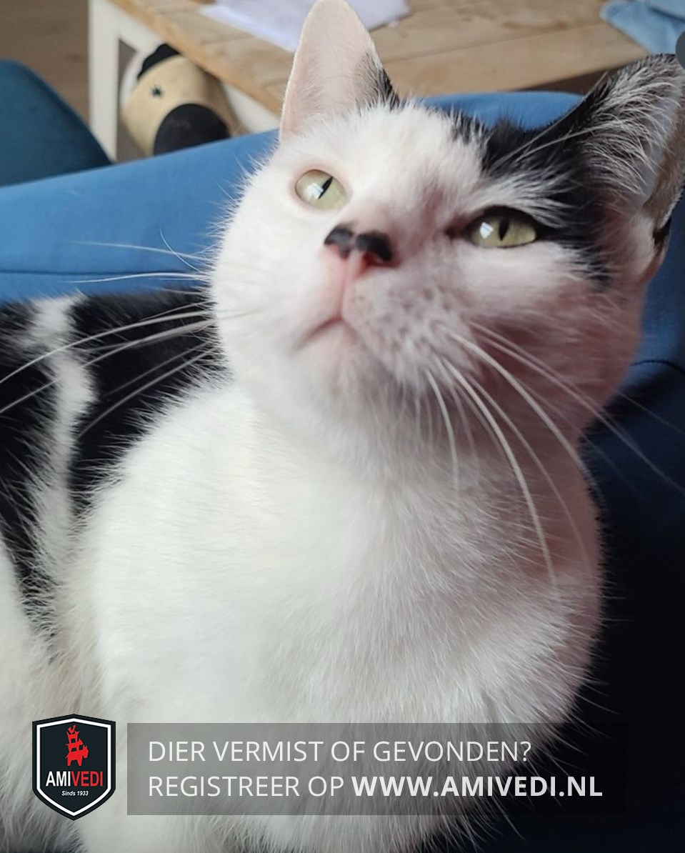 | Signalement | Linkeroor is zwart,witte snoet,zwart vlekje bij de neus,witte borst,zwart op de rug.witte voorpoten. |