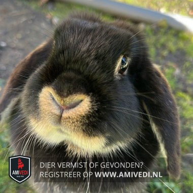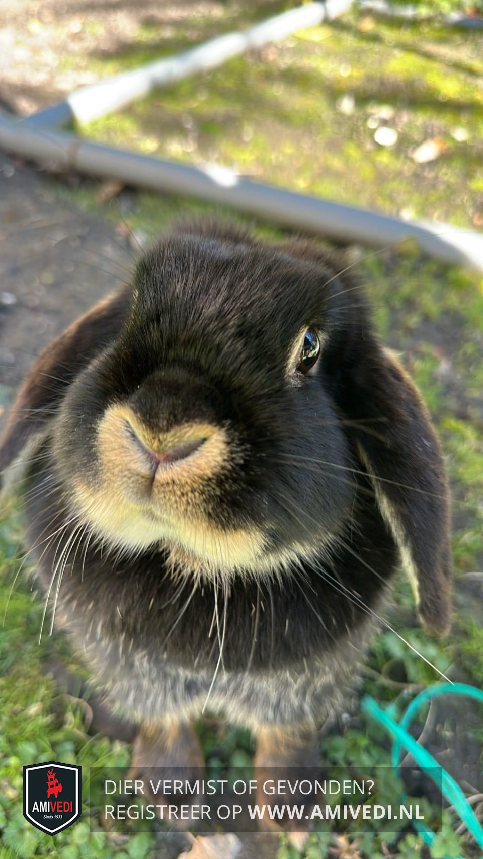| Signalement | Bruin konijn, lichtbruin rondom neus en mond. Hangoren. |