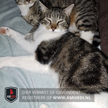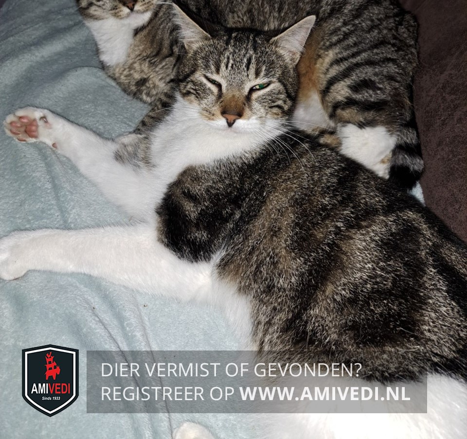 | Signalement | Grijs zwart gestreept op de kop, witte bef en witte poten voor en achter, grijs zwart gestreepte rug, roze neus. |