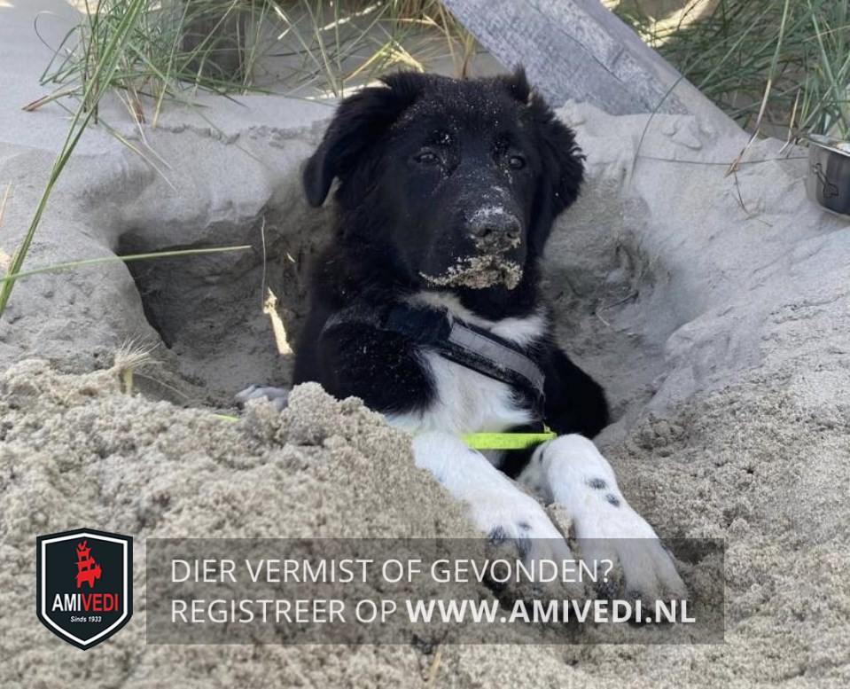 | Signalement | Zwarte hond met witte poten. Grootte 30 kg. Kop van een Friese Stabij zijn lijf meer van een herders hond maar dan wel zwart. Draagt zwart tuig. |