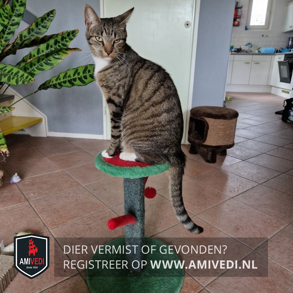 | Signalement | Cypers bruine met zwart gestreepte kat. Er zit hier en daar ook wat grijs in. Voor witte teentjes en achter witte sokjes. Witte bef en wit kinnetje. Bruin snuitje. Smalle strepen zwart behalve bij de voorpoten daar zijn ze dikker. Staart is grijs zwart gestreept. |