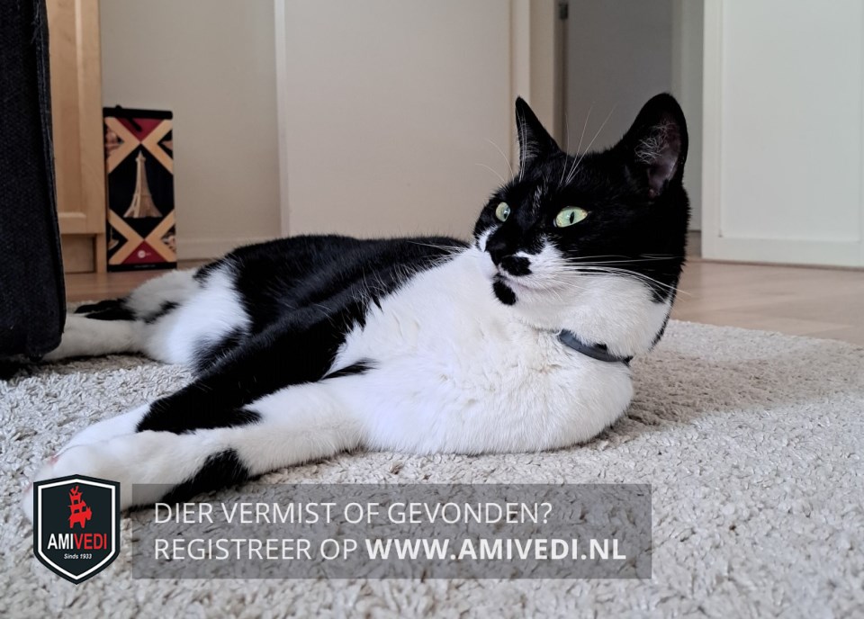 | Signalement | Zwart/witte kater. Zwart kopje dat doorloopt over en langs de oogjes, zwart neusje zwart vlekje op de linker bovenlip en op de kin. Wit rond het nekje. Witte hals en borst. Op de rug zwart dat doorloopt over de flanken. Rechter voorpoot zwart met een wit sokje, linker voorpoot wit met zwarte vlekjes aan de zijkanten. Achterpootjes wit met wat zwarte vlekjes. Het wit loopt door over de heupen. Donkergrijze vlooienband. |