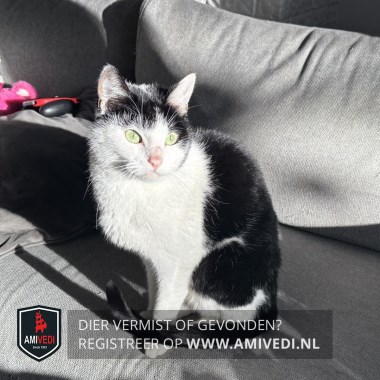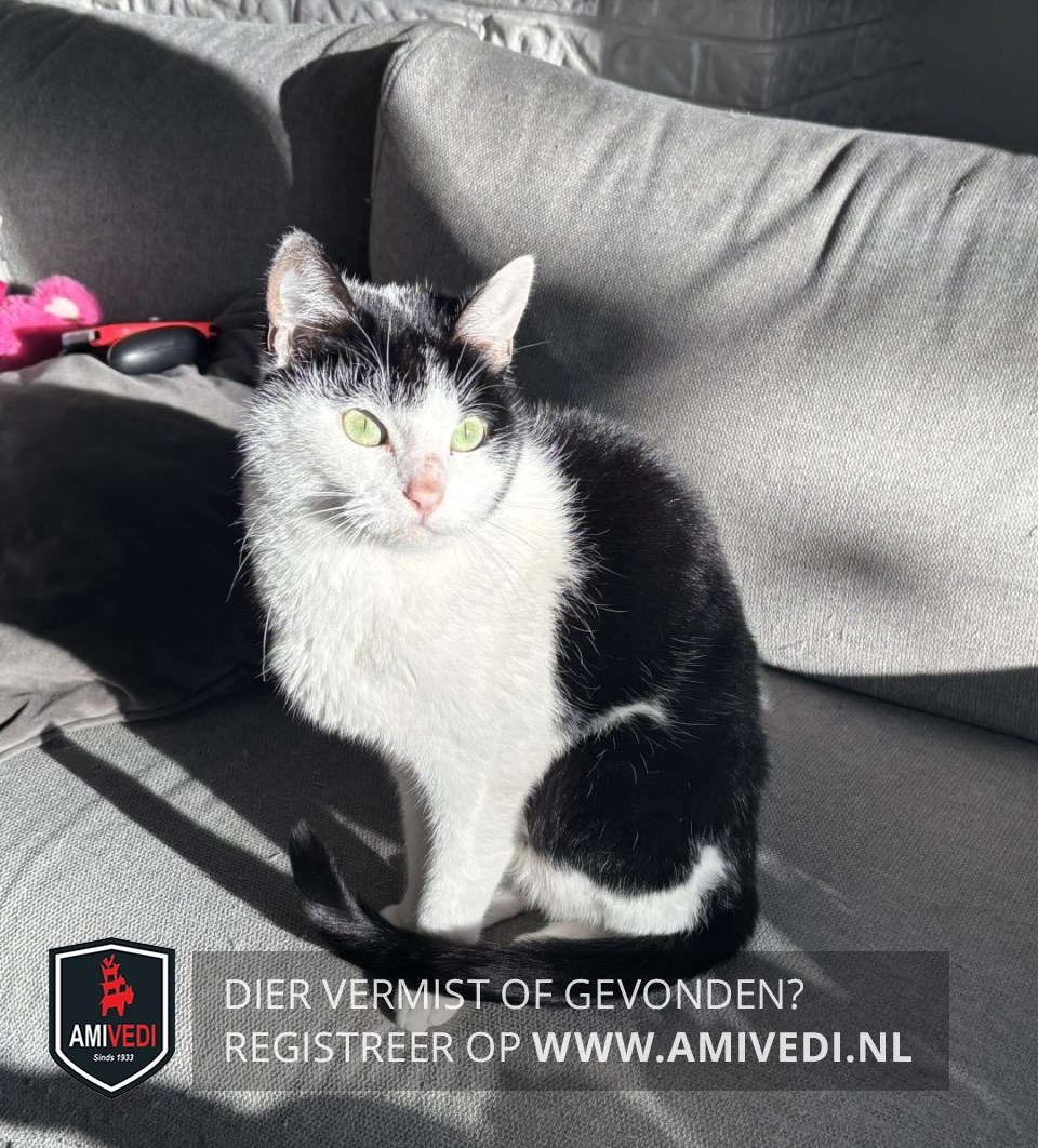 | Signalement | Zwart/witte kater. Zwart op het kopje dat doorloopt rond de oortjes. Wit snuitje, roze neuspunt. Grijs vlekje op de rechter kaak. Witte borst en buik. Zwart dek over de rug dat doorloopt over de flanken, witte pootjes en wat wit op de heupen. Zwart/grijze staart. |