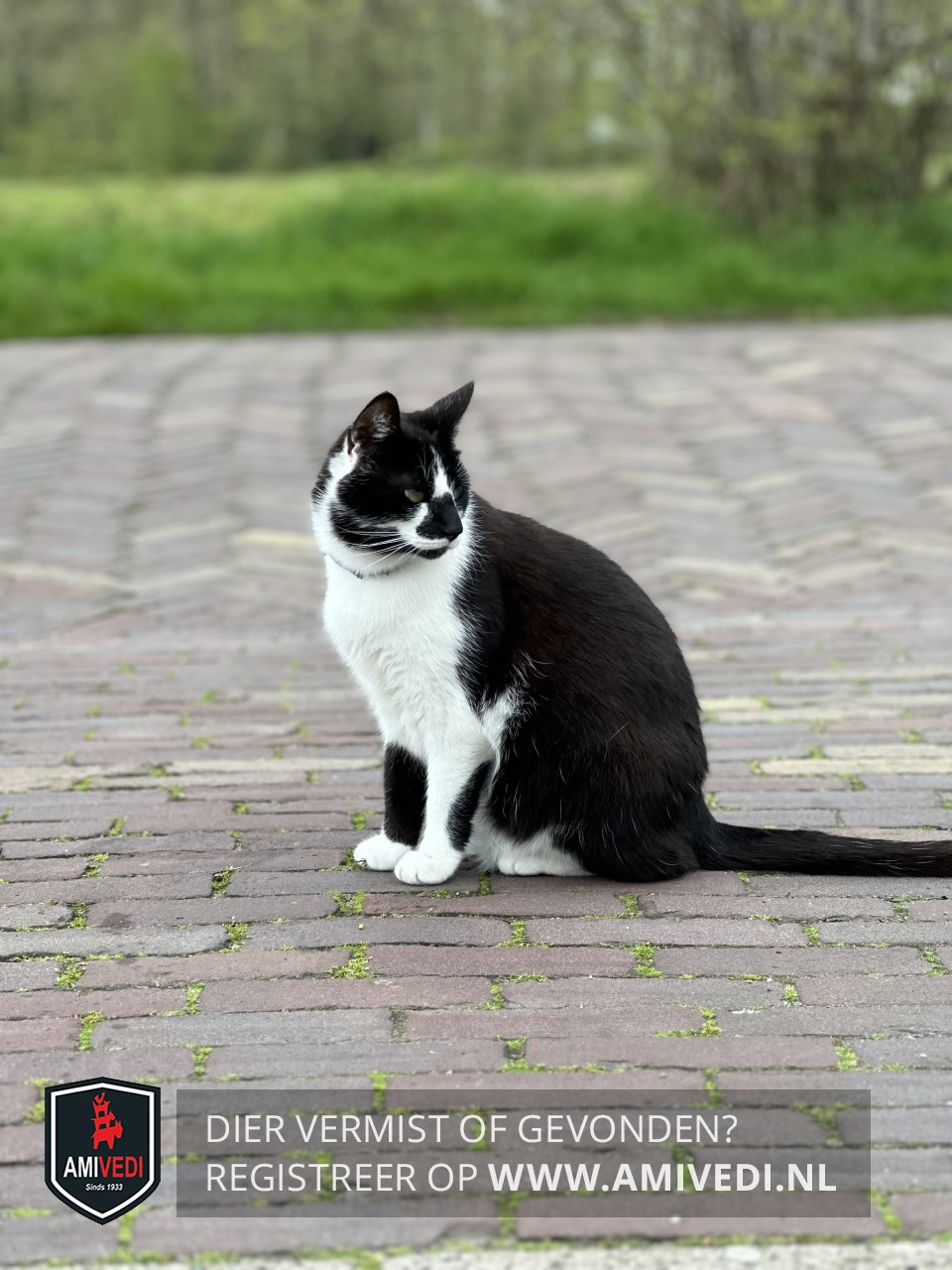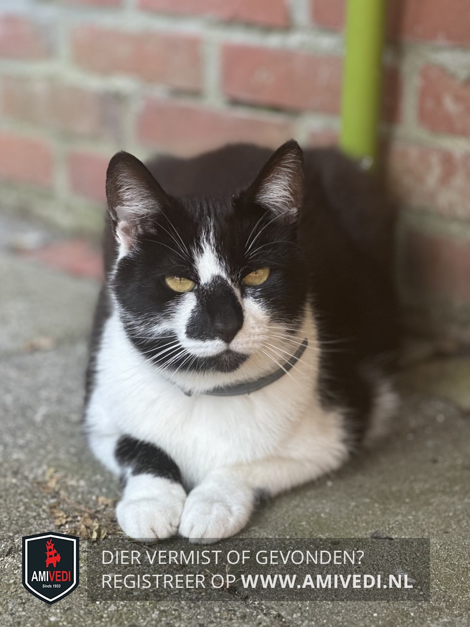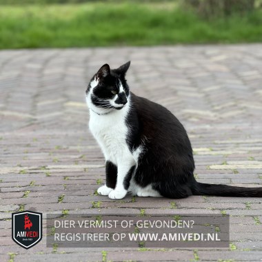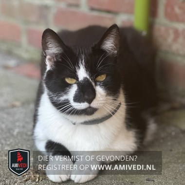 | Signalement | Zwarte kop, wit kort streepje op de bles, wit op de snuit, zwart op de neusbrug boven de neus, zwart op de kaaklijn naar kin rechters, witte bef, borst, buik, zwart lijf en staart, rechter voorpoot is op kous hoogte zwart met wit voetje, linker voor poot is wit aan de voorkant en zwart aan de achterkant, achter poten witte sokjes. |