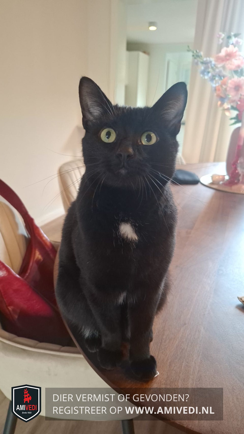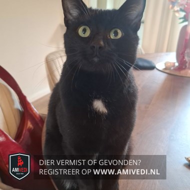 | Signalement | Europese korthaar kater volledig zwart met wit plukje op de borst en een paar witte haartjes op de buik. |