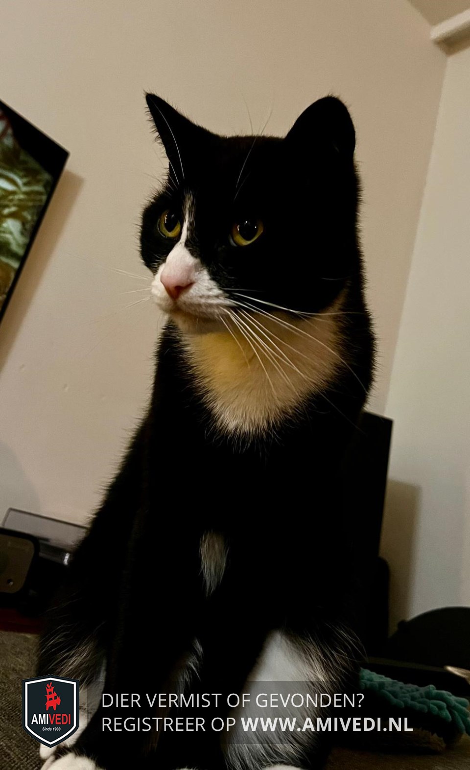 | Signalement | Overwegend zwart met witte accenten: dun wit streepje over de neusbrug, driehoekje wit rond het roze neusje, witte snorharen, witte kin en bef, groot wit vlak op de buik; witte voetjes aan de voorpoten en witte kousen aan de achterpoten. Buiten niet gewend. |