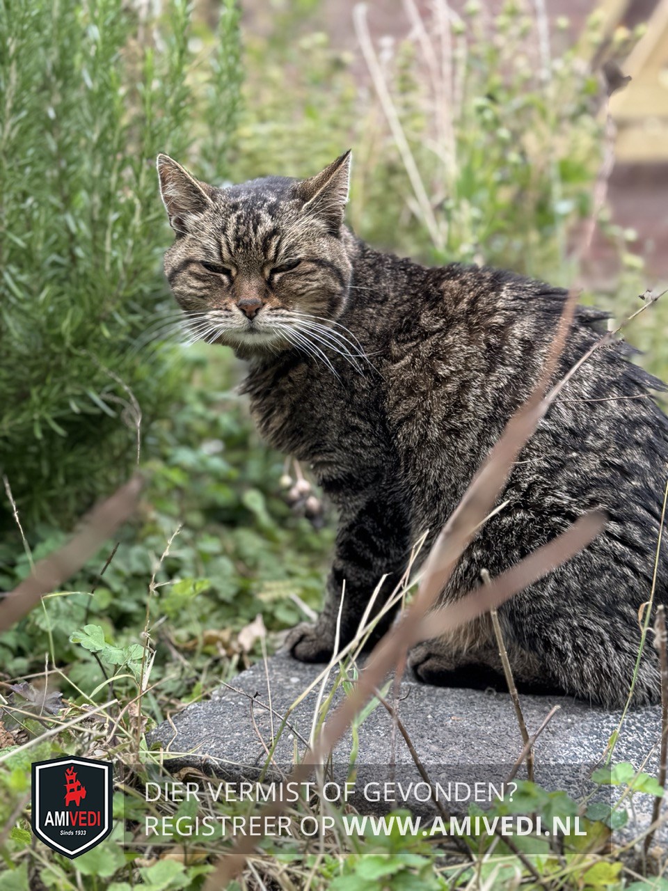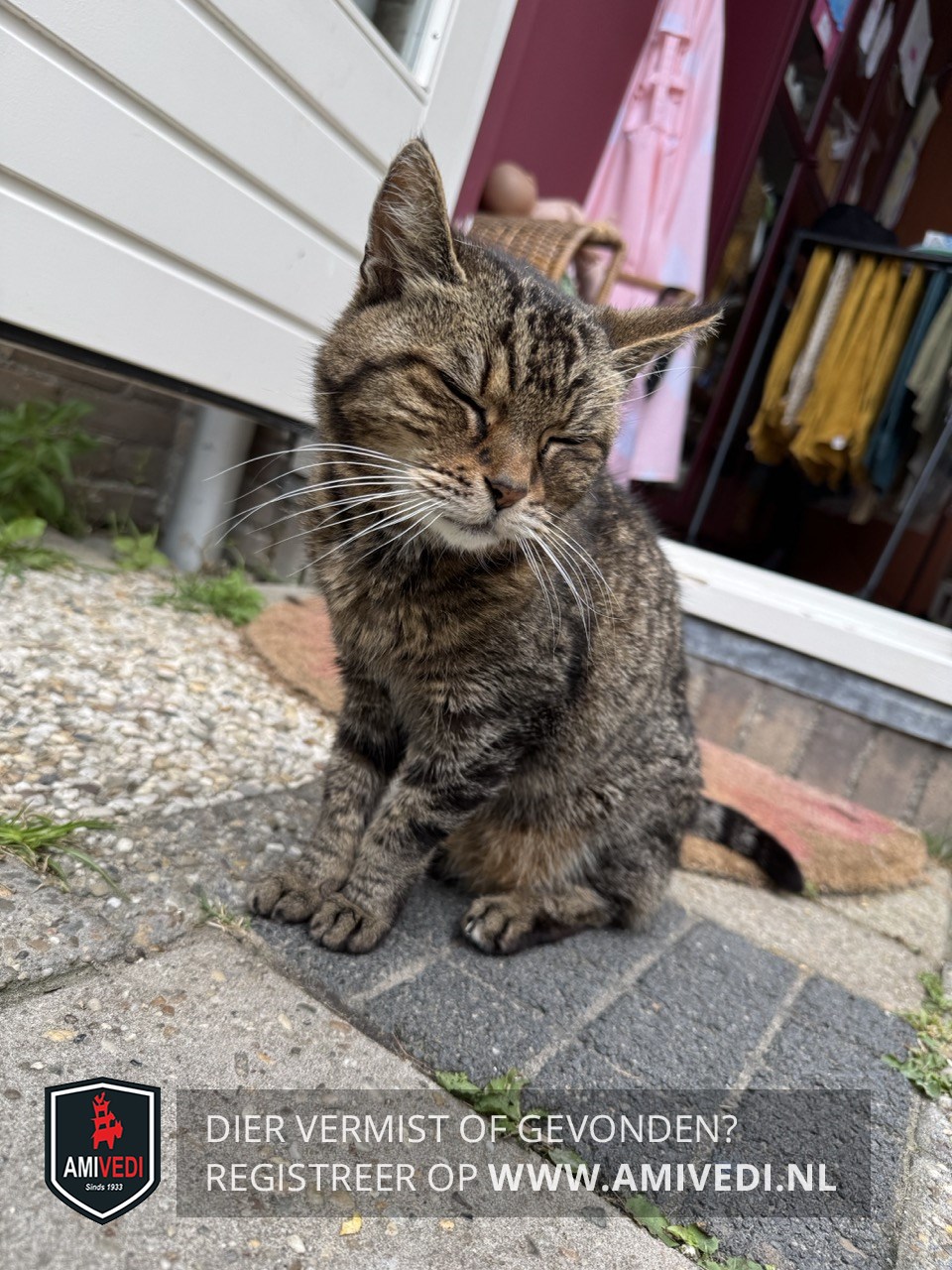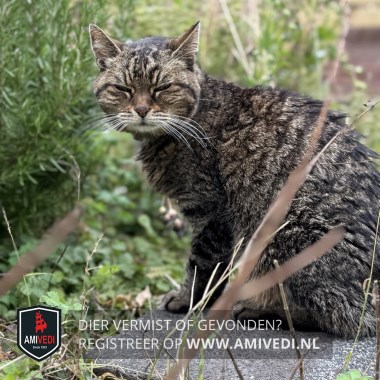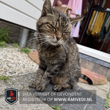 | Signalement | Bruin/zwart Cypers met wat wit. Witte snor en kin. Lange staart. (oudere poes) |