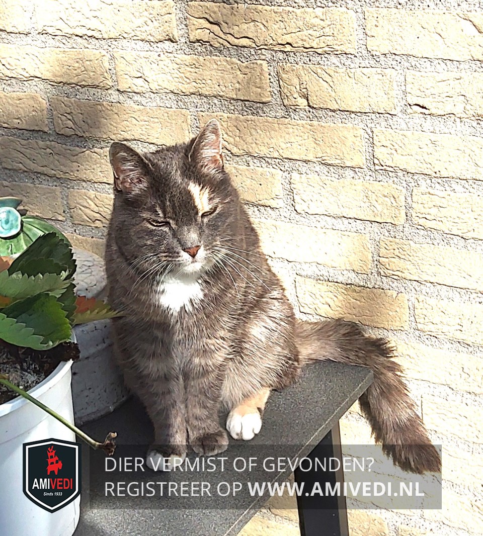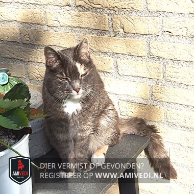 | Signalement | Blauwgrijs gestreept met rood en wit. Rood vlekje boven linkeroog. Wit "snorretje"en witte kin, hals en bef. Rechter voorpoot witte teentjes. Linker achterpoot witte teentjes met daarboven rood. |