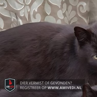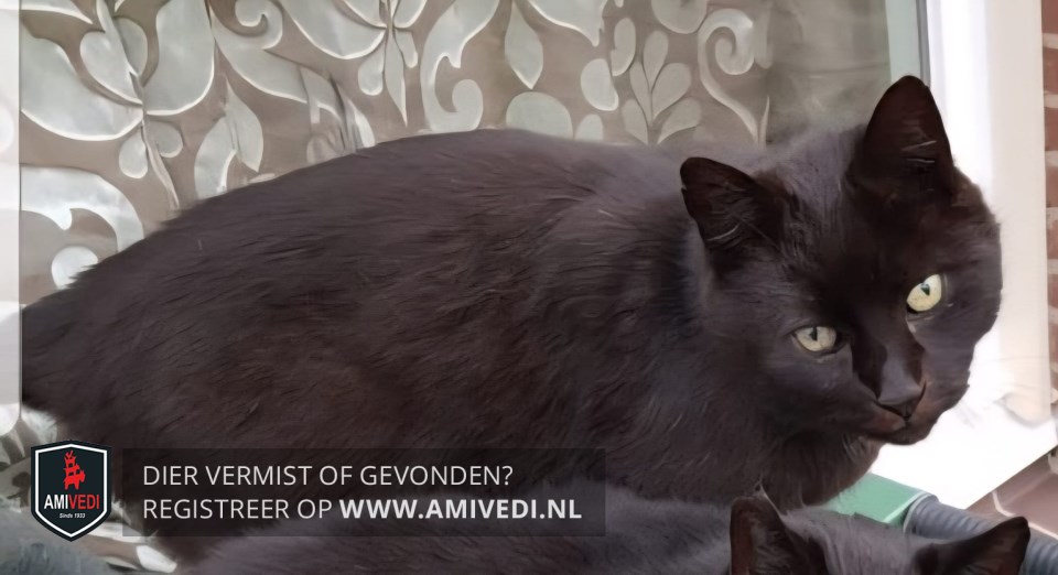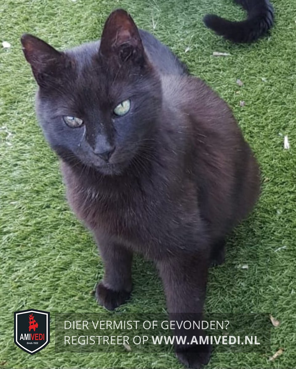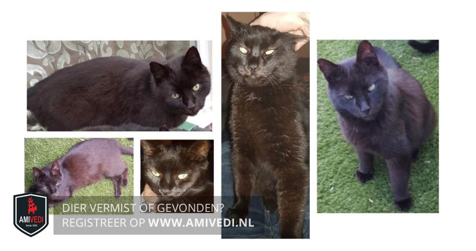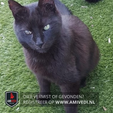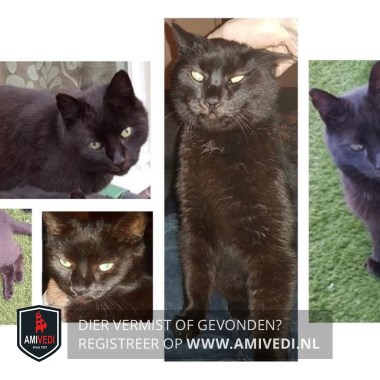| Signalement | Geheel zwarte kat, scheef koppie, rechter oog is dof. |