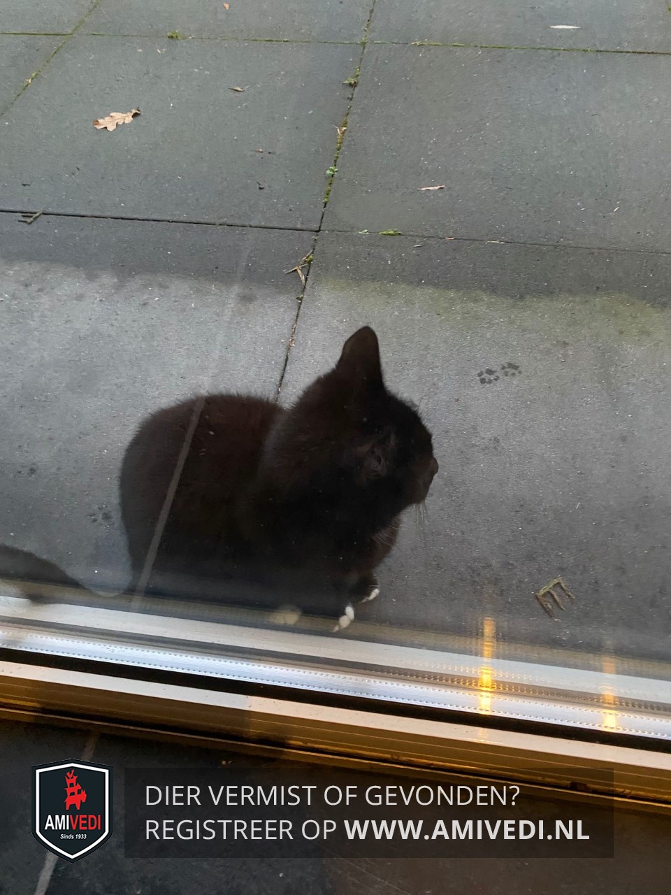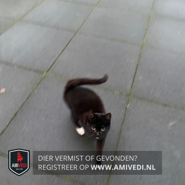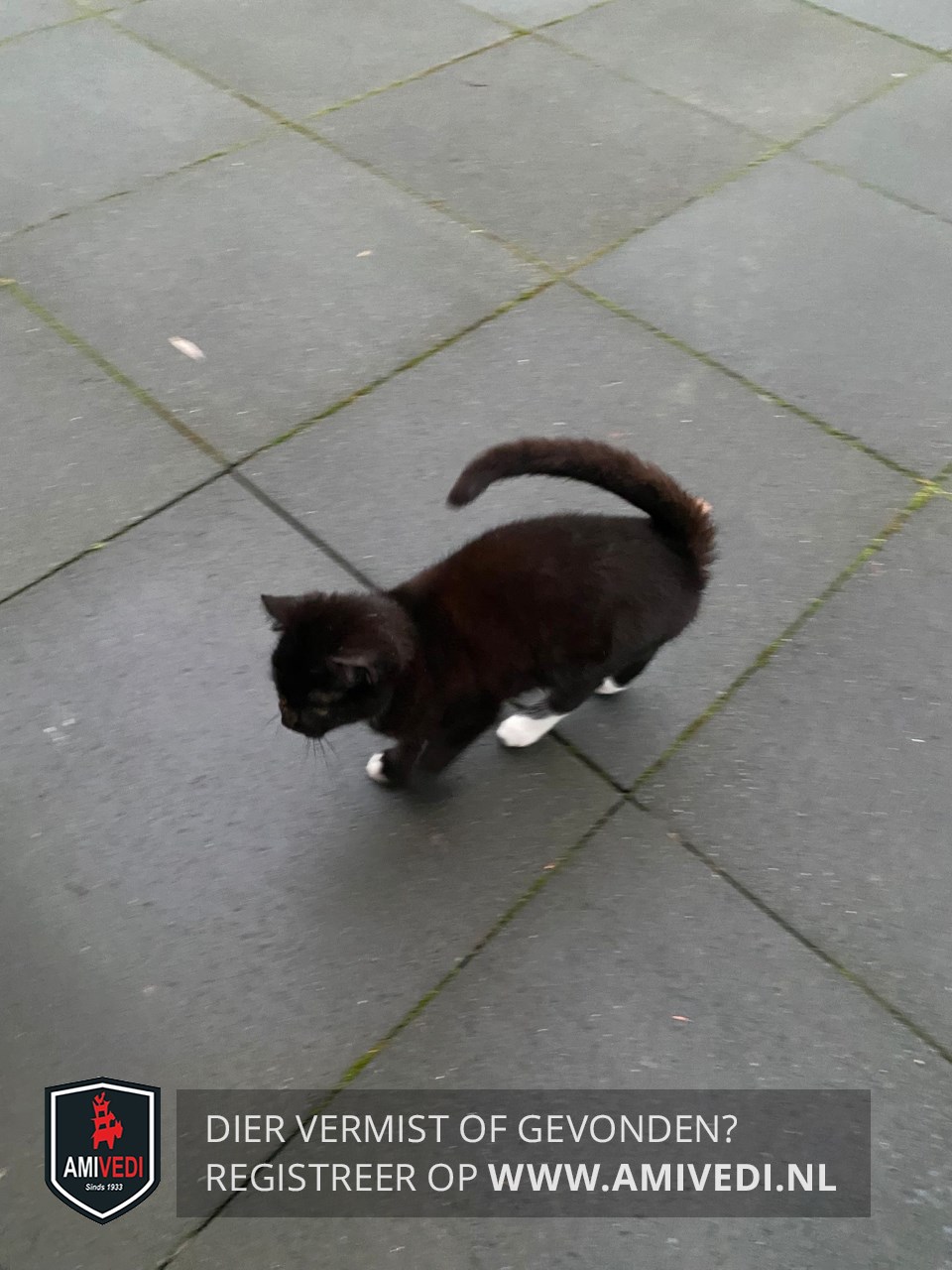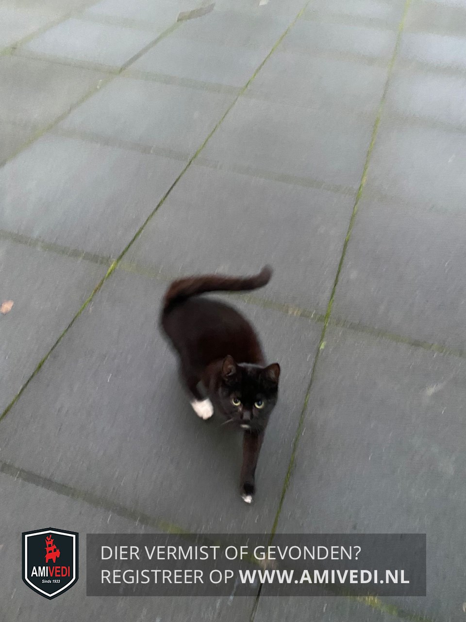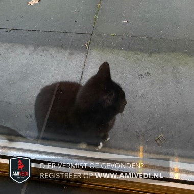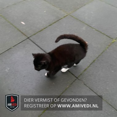 | Signalement | Zwarte kleine kat. Zwart kopje, met klein wit vlekje rondom kin/bef. Witte teentjes aan beide voorpootjes. Wit sokje aan linkerachterpoot, wit voetje aan rechterachterpoot. |