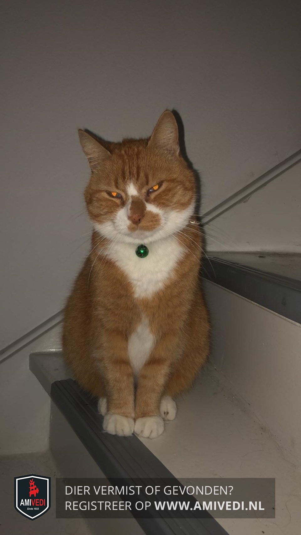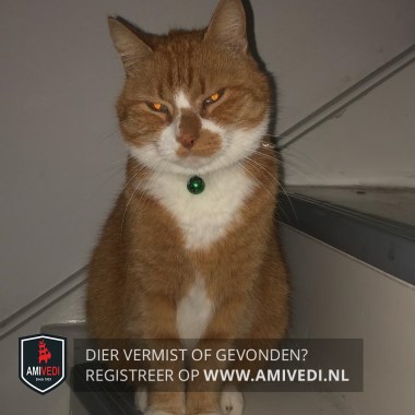 | Signalement | Cypers rood met wit, wit vlekje bles, rode neus loopt in een vlek door links van de snuit, aan beide zijden witte kaken, witte kin, witte bef, witte borst, witte voetjes alle poten, verder cypers rood. Vanwege een te hoge schildklierwaarde moet ze 2 keer per dag medicatie. |
