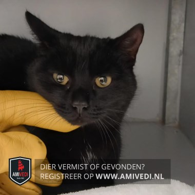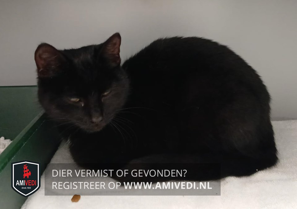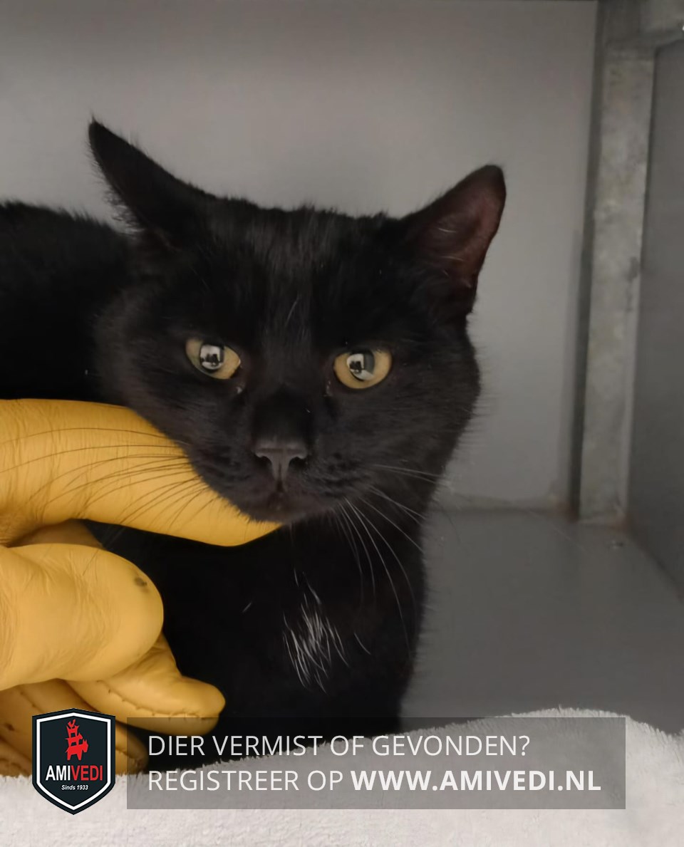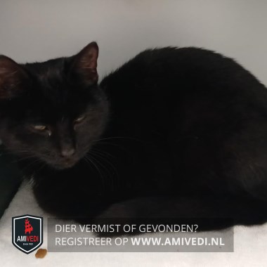 | Signalement | Geheel zwarte poes met een paar witte haartjes op de borst |