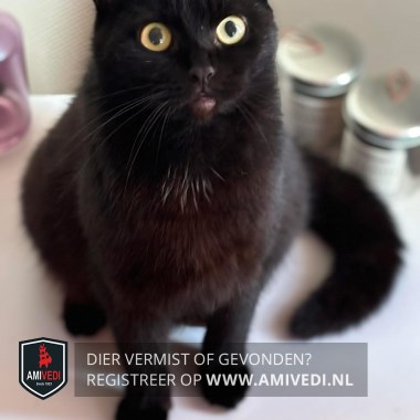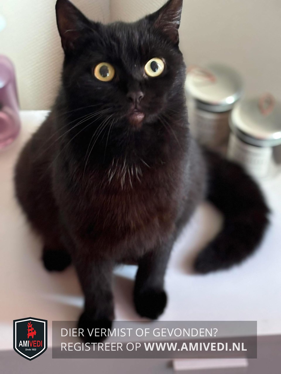 | Signalement | Geheel zwart. Paar witte haartjes op de bef. Loopt ietwat mank. Onderlip oogt wat kaal. |