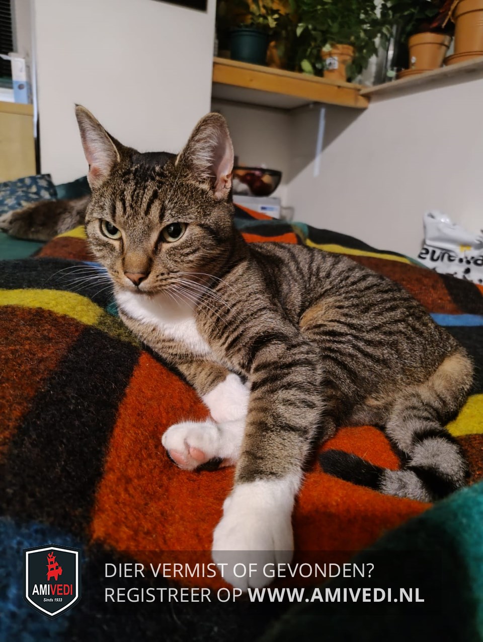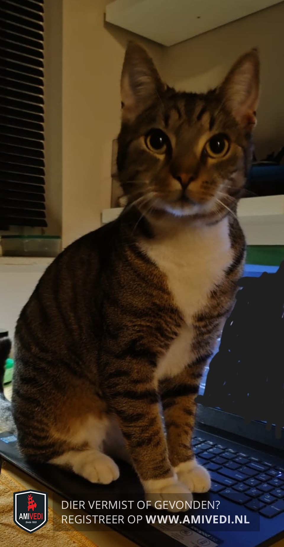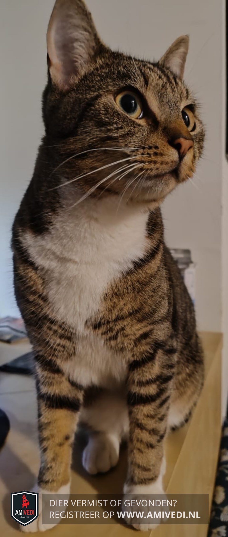 | Signalement | Cypers bruin/zwart gestreept met wit. Witte borst wat in een smalle streep uitloopt naar de buik. Aan de voorpoten witte voetjes Ook wat wit aan de achterpoten. Rechter poot heeft 3 zwarte kussentjes en een roze. Zwarte staartpunt. |