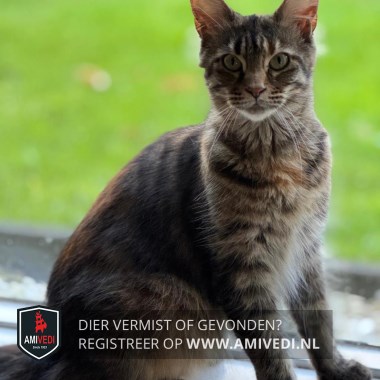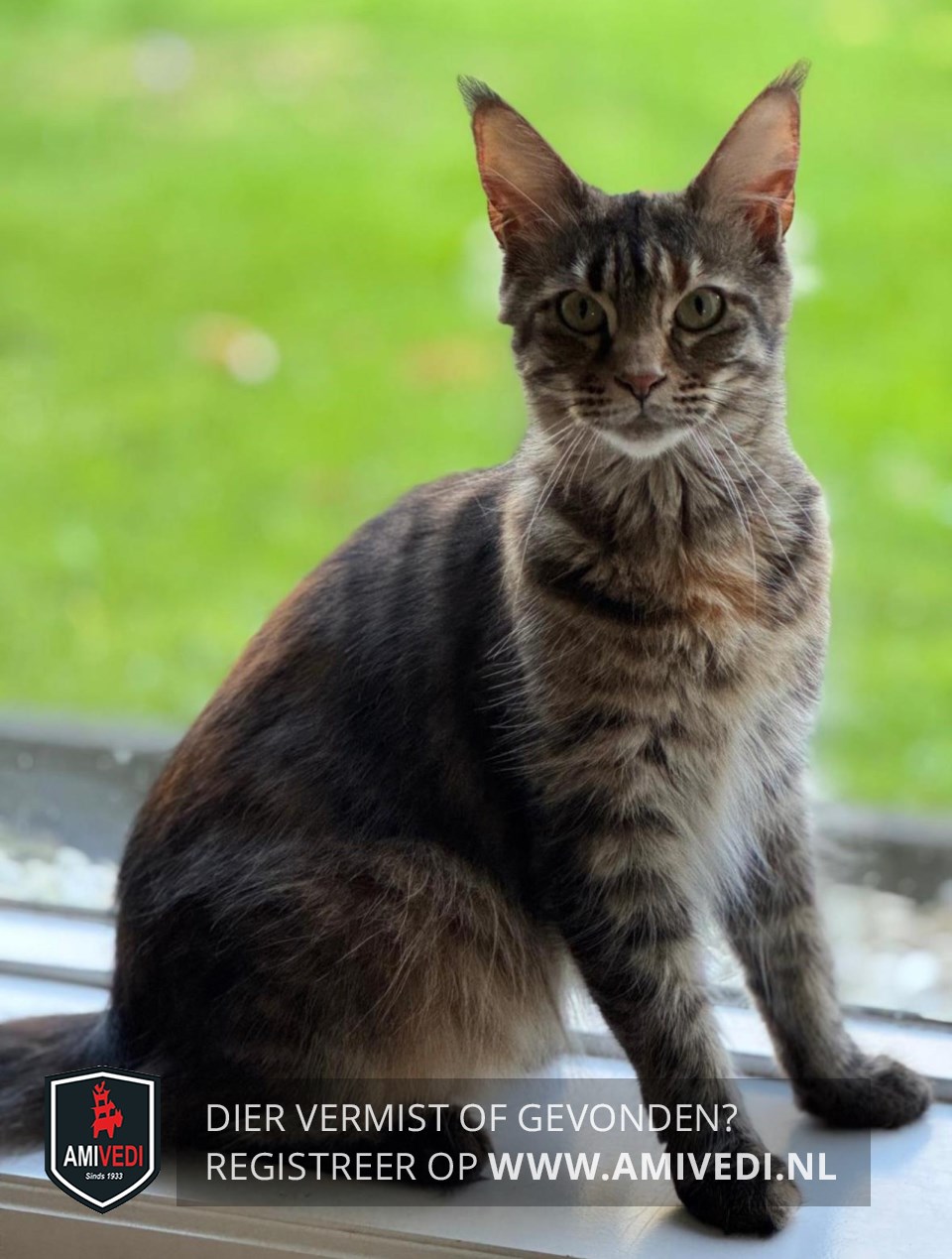 | Signalement | Bruin/rossig/zwart cypers gestreept met witte kin. Halflangharig. Groenige ogen. Pluimpjes op de oren. Rossig vlekje op de borst. Rossige gloed over de rug. Donkere voetjes. Slank van postuur. |