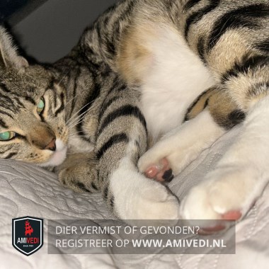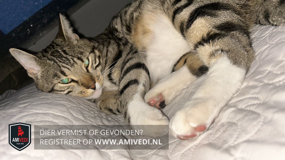 | Signalement | Cypers bruin zwart gestreepte kat met wat wit aan de kin en bef, witte onderkant en gestreepte bovenkant. Witte laarsjes aan de pootjes. |