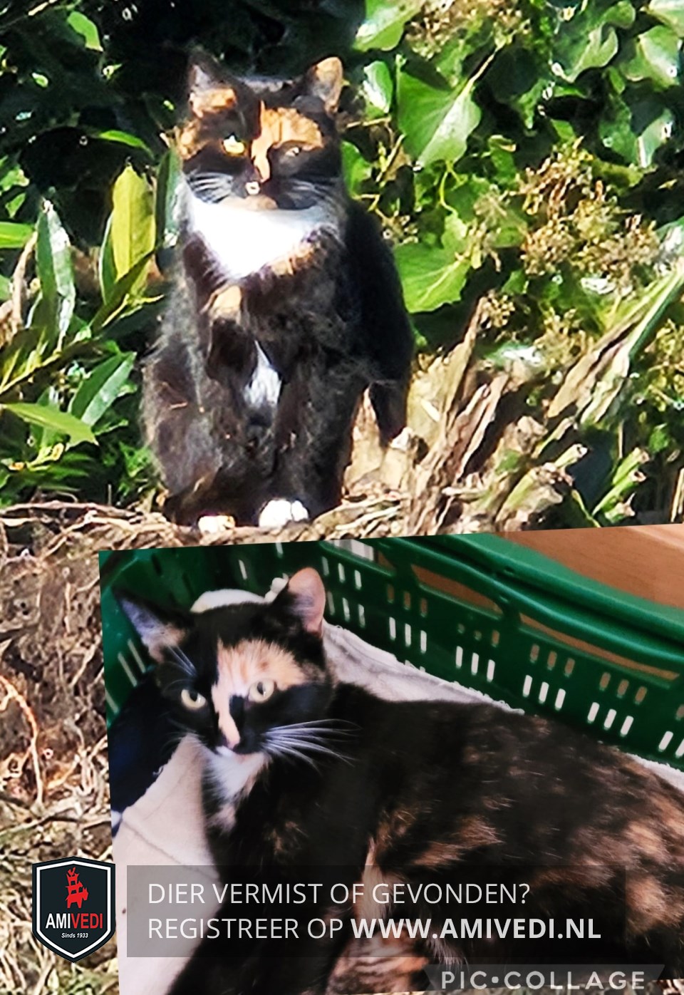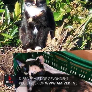 | Signalement | Schildpad met wit. Voornamelijk zwart met rode vlekjes op het lijf, bovenop de kop, rechteroor en rond de oren zwart, grote cypers rode vlek boven het linkeroog loopt door tot halverwege het oog en links over de neus, linkerwang zwart, rechterkant kop zwart doorlopend rond het oog en over de wang, zwarte snoet, rechts naast het neusje een wit vlekje, witte snorharen, witte bef, onder de bef 2 rode vlekken, witte vlek tussen de voorpoten, voorpoten meest zwart met witte tenen. |