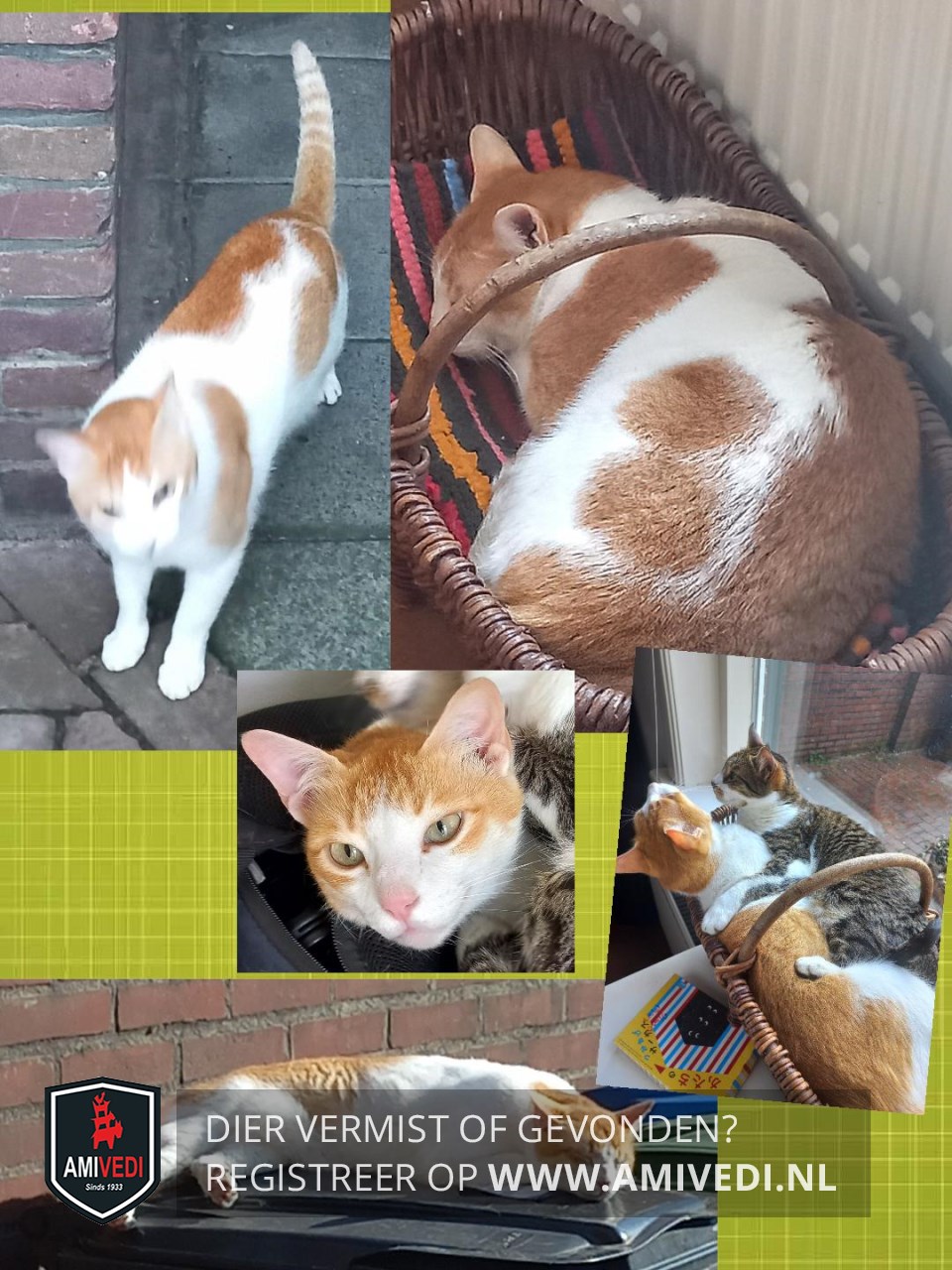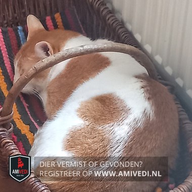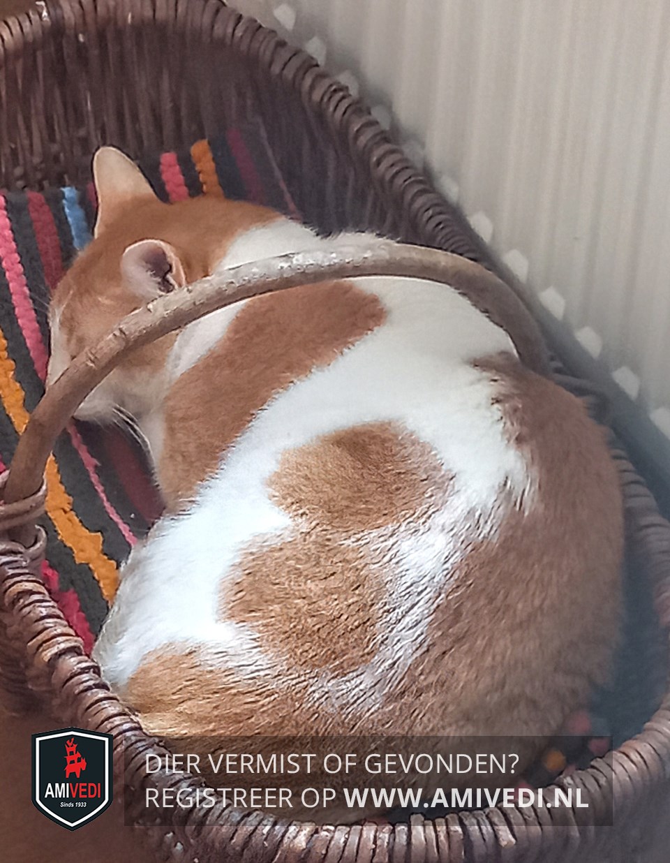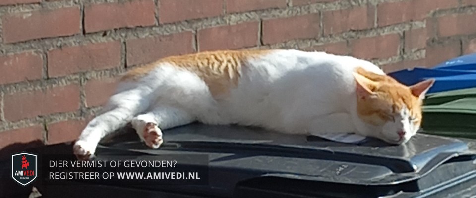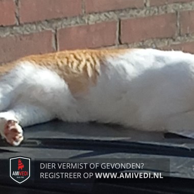 | Signalement | Wit met rood boven de ogen en op kopje, grote en kleine rode plekken op lijf, rechts meer dan links, staart rood met uiteinde rood-wit geringd. |