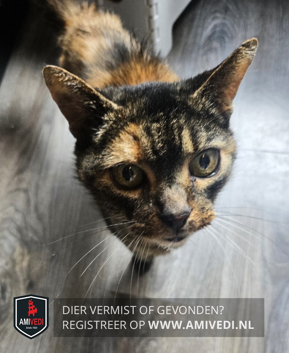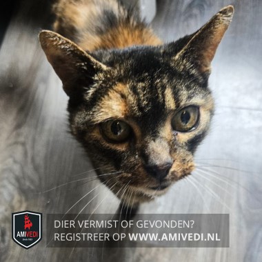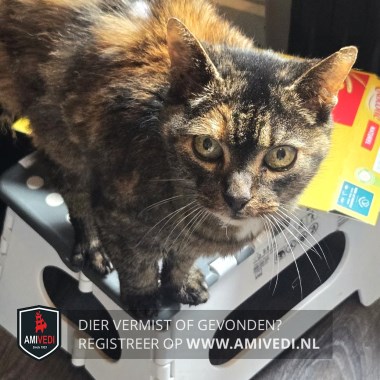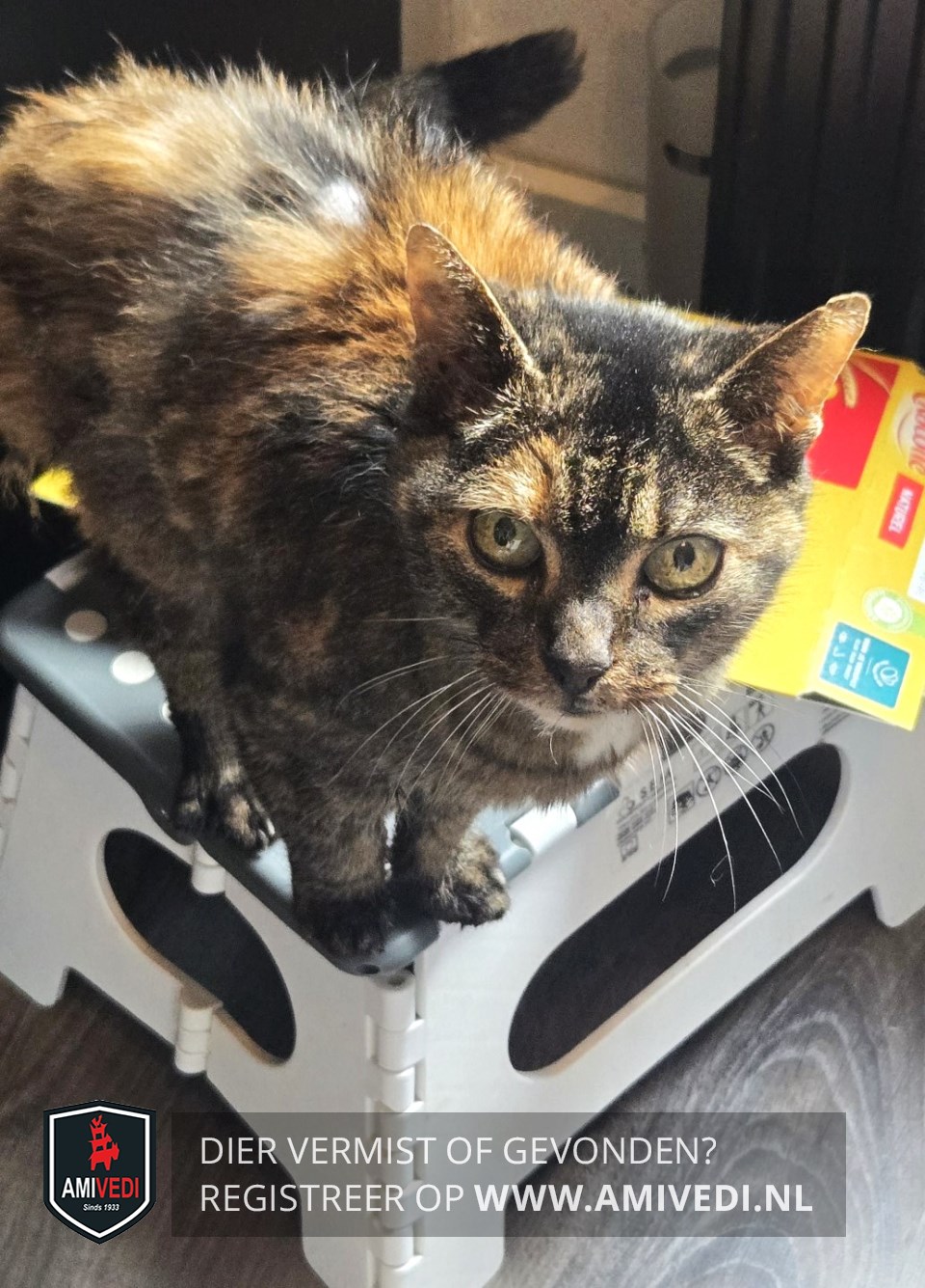 | Signalement | Cyperse schildpadpoes. Voornamelijk rood/oranje met zwart gemarmerd, oren zwart en rood, bovenop de kop zwart, op het voorhoofd opstaande cypers zwarte strepen, boven rechteroog een rode vlek, rond de ogen lichtrode randjes, zwart neusje, kin wit, op de borst een witte vlek, poten meest zwart met een beetje rood. Ze is doof .. heeft een hele slechte vacht en is erg mager. Ze lijkt een zwerfkat maar leeft dus al 20 jaar heerlijk warm bij ons. |