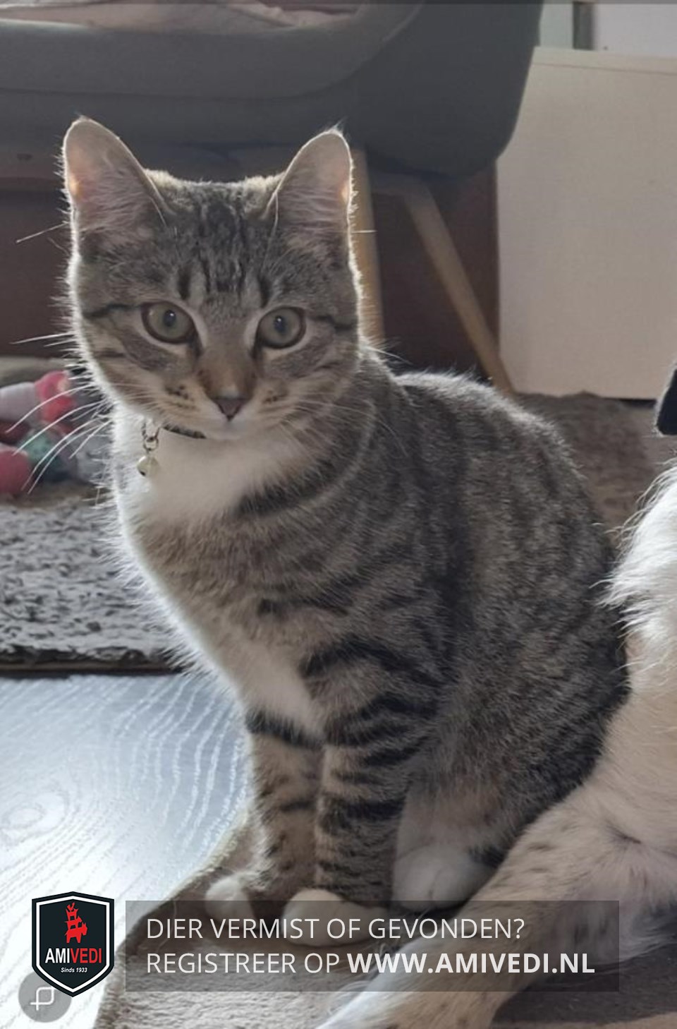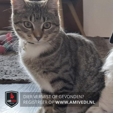 | Signalement | Cypers grijs/zwart met wit. Wit onder het neusje. Witte kin en bef. Witte vlek op de borst. Witte voetjes. Wat dikkere zwarte strepen over de voorpoten. |