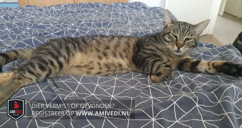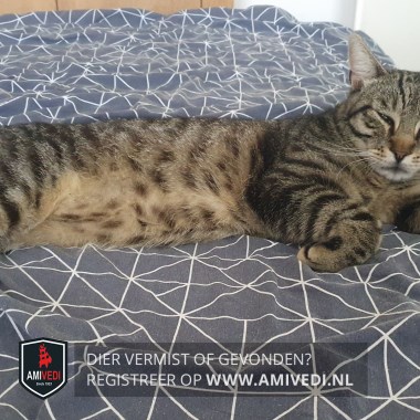 | Signalement | Cypers bruin - zwart gestreept met wit onder de neus, witte kin, bruine buik. |