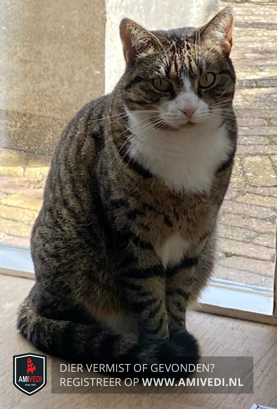 | Signalement | Cypers bruin-zwart gestreept met wit. Witte snuit en bef. Bruine kin, doorlopend naar rechter wang. Wit tussen voorpoten en wat op de buik. Voor witte voetjes. Links achter wit voetjes, rechtsachter wit sokje. Een dikke zwarte streep op haar rug. |