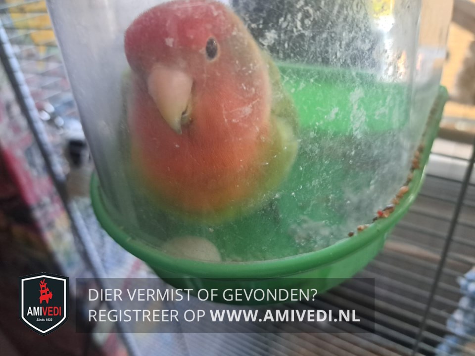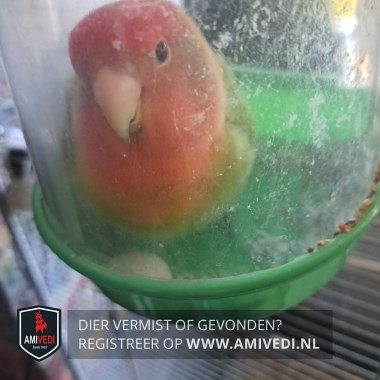 | Signalement | Rood kopje/gezichtje, roze snavel, Rood/oranje borst. Groen lijfje. Niet tam. Rood ringetje. |