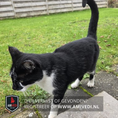 | Signalement | Geheel zwart van kleur met een witte kin, bef, borst. beide achterpoten een witte sok. rechter voorpoot een witte voet en linker voorpoot een witte laars. |