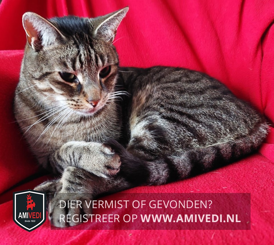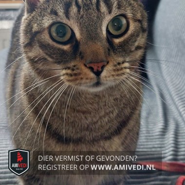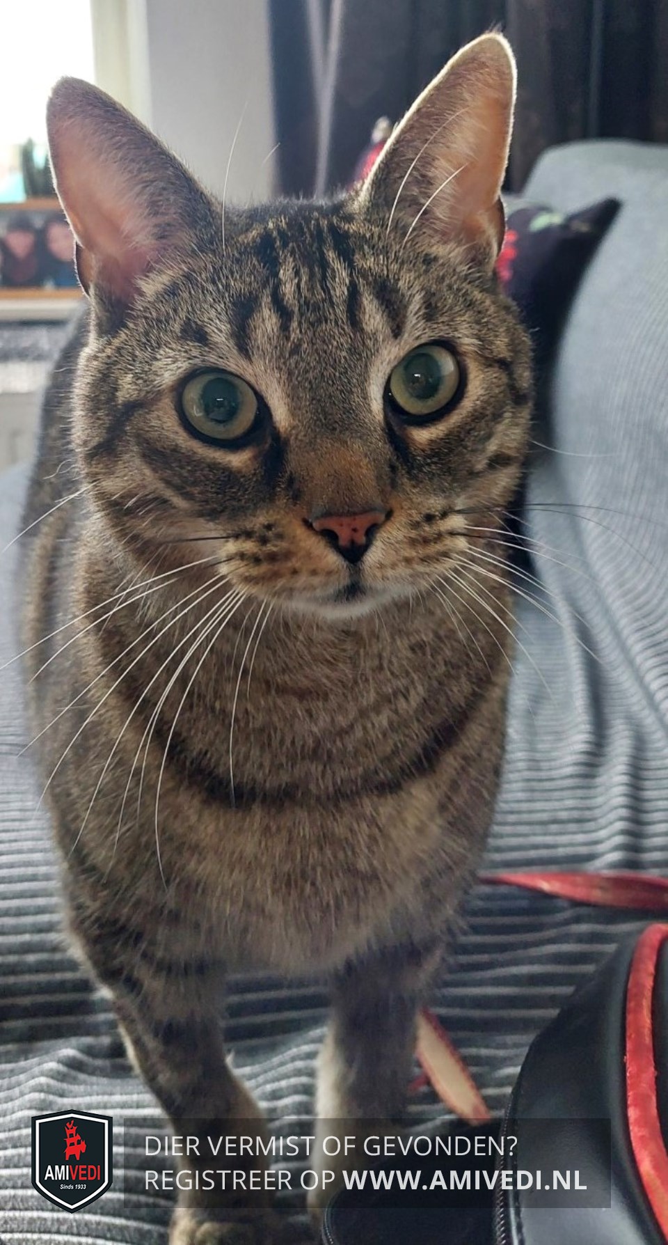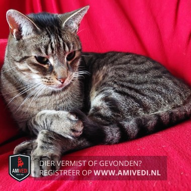 | Signalement | Cypers bruinzwart gestreept met wit. Voornamelijk cypers bruin, beige randjes rond de ogen, bruine neus, beige op de snoet, roze neusje met een zwart randje, onder het neusje een klein beetje wit, kin en onder de kin wit, staart cypers geringd met een zwarte staartpunt. Heeft een plek op de buik met weinig haar. |