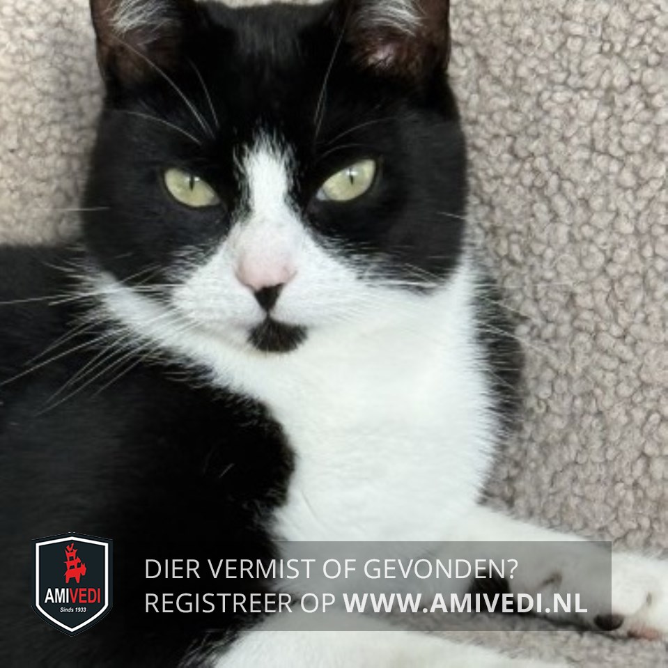 | Signalement | Zwart met wit. Witte bles en snoet. Zwart vlekje onder de neus en op de kin. Witte bles, borst en poten. Op de achterkant van de linkervoorpoot zit een zwarte vlek. |
