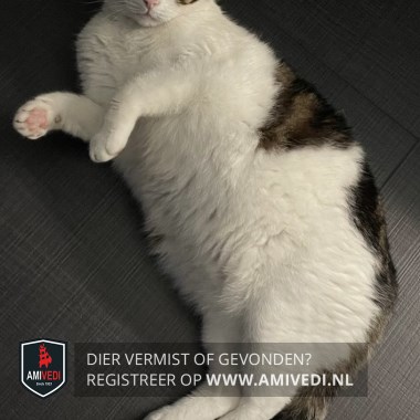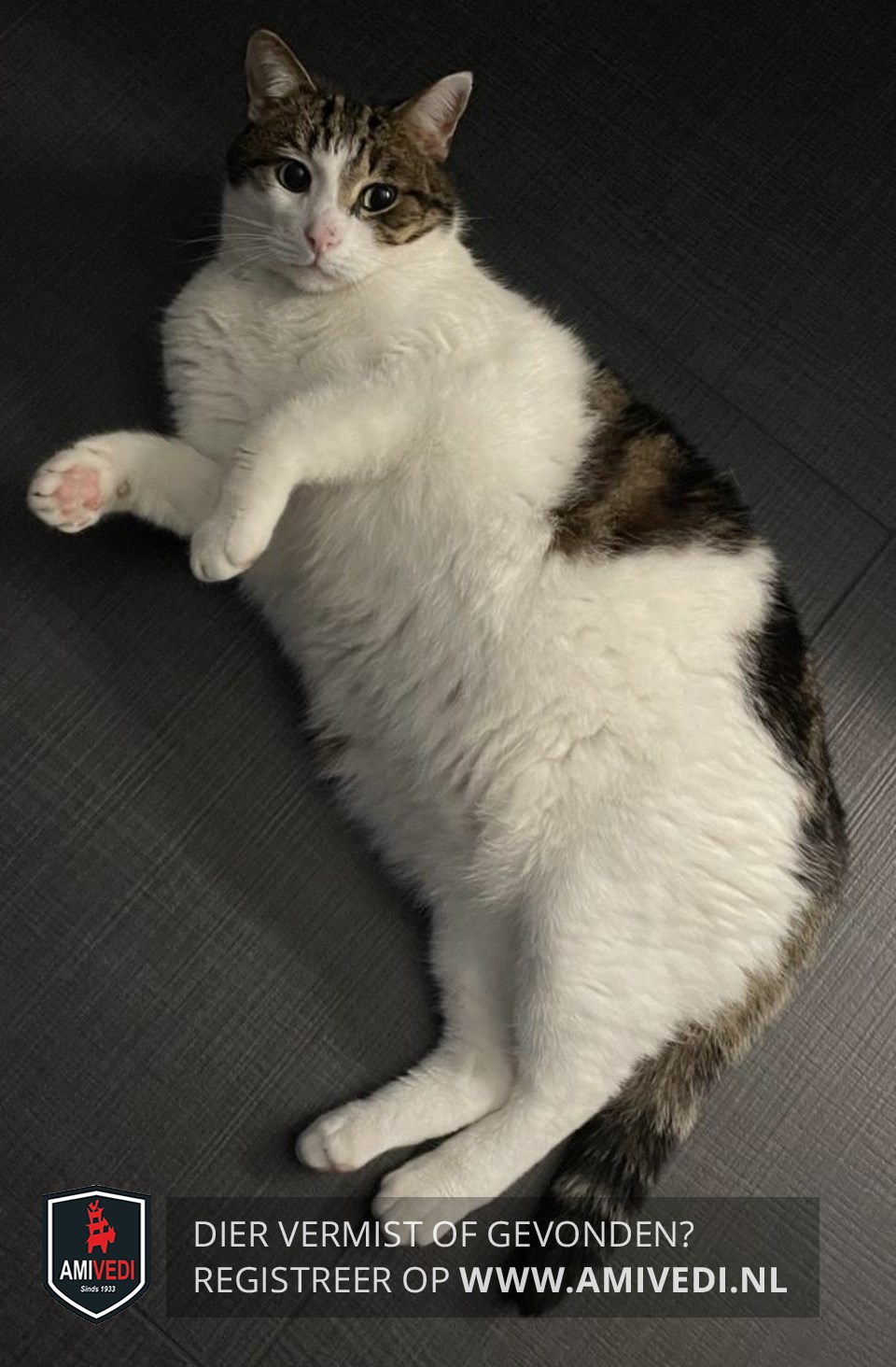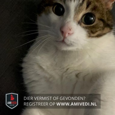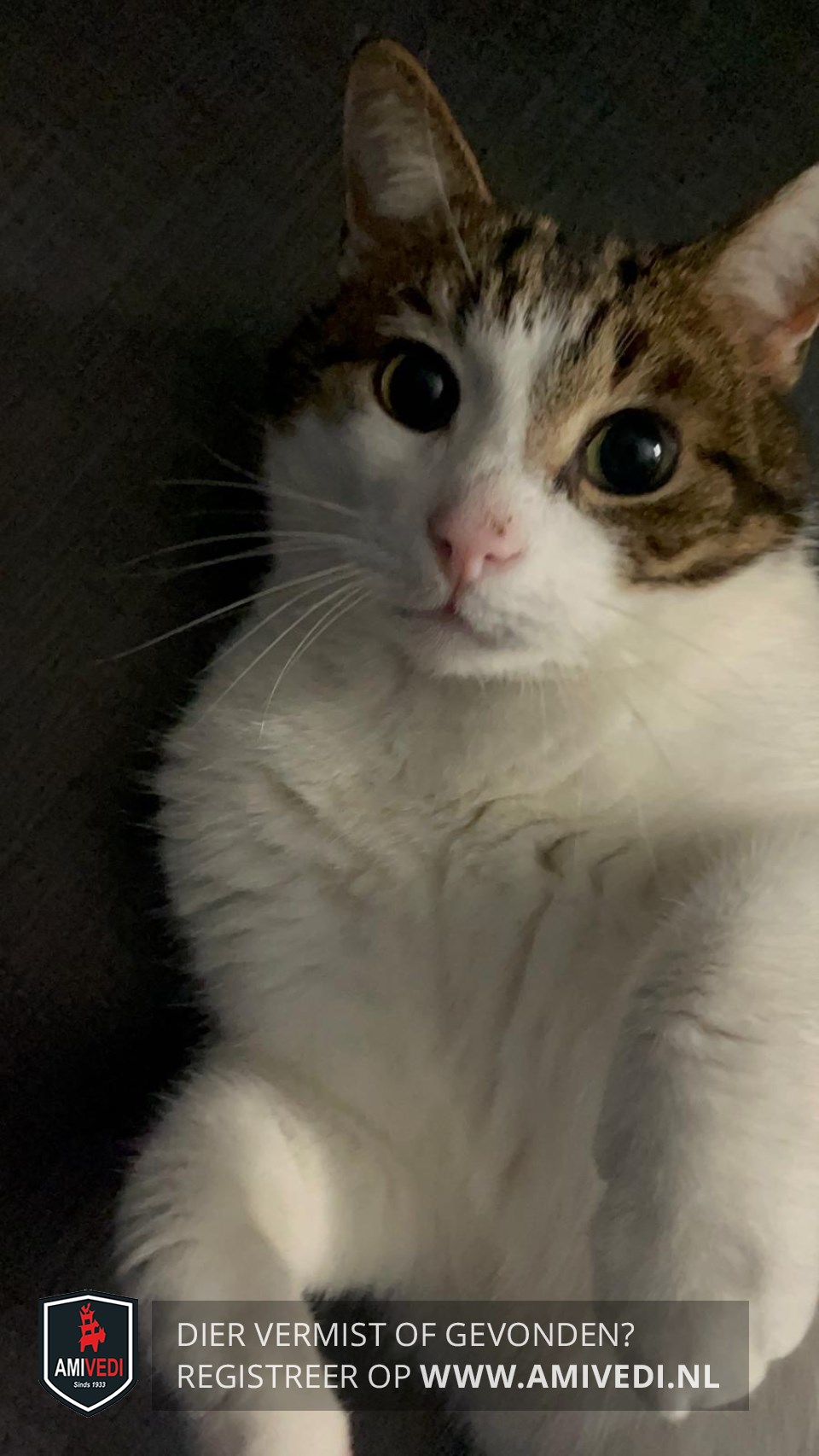 | Signalement | Voornamelijk wit. Cypers bruin/grijs/zwart op het kopje dat doorloopt over de slapen, langs de oogjes, verder wit snuitje, roze neuspunt. Bruin streepje links langs de neus. Witte borst, buik, schouders, flanken en witte pootjes. Op de rug een cypers bruin/grijs/zwart dek dat doorloopt over de billen. MEDICATIE VOOR ZIJN HART NODIG. |