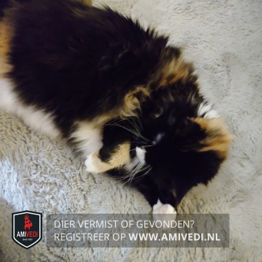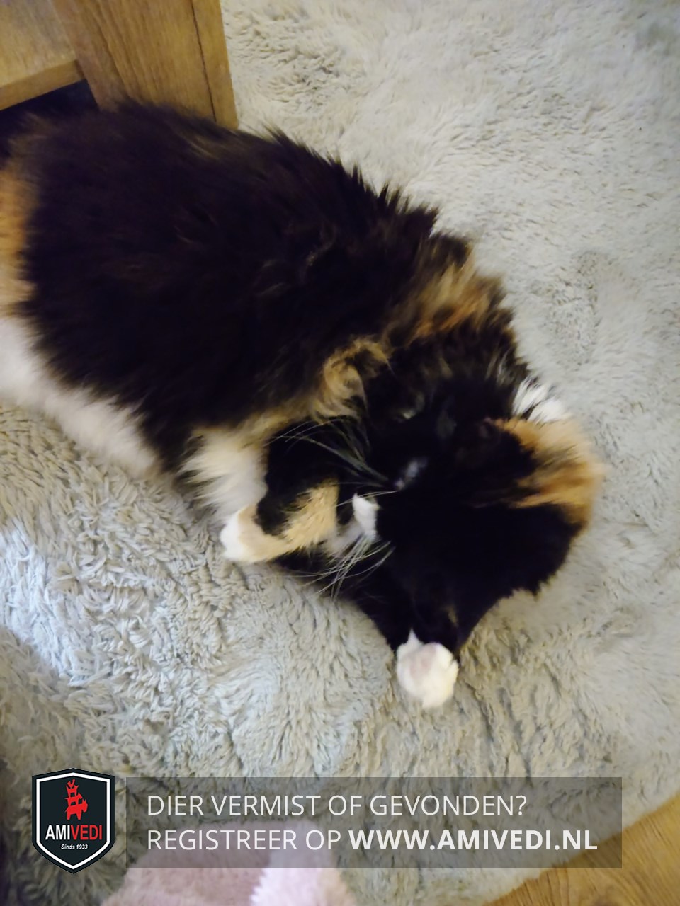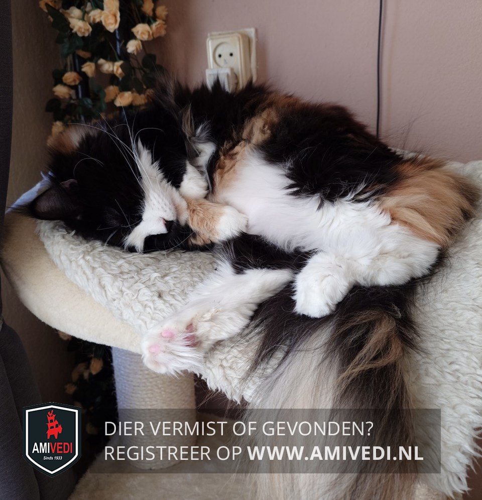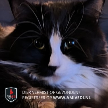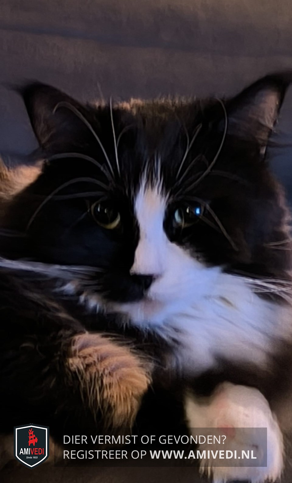 | Signalement | Torty Maine Coon. Zwart met witte bles en neus. Rechts witte wang. Witte kin, bef, buik en achterpoten. Voor witte teentjes. Rood op linker flank en bil, rechter voorpoot en staart. |