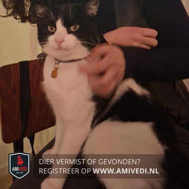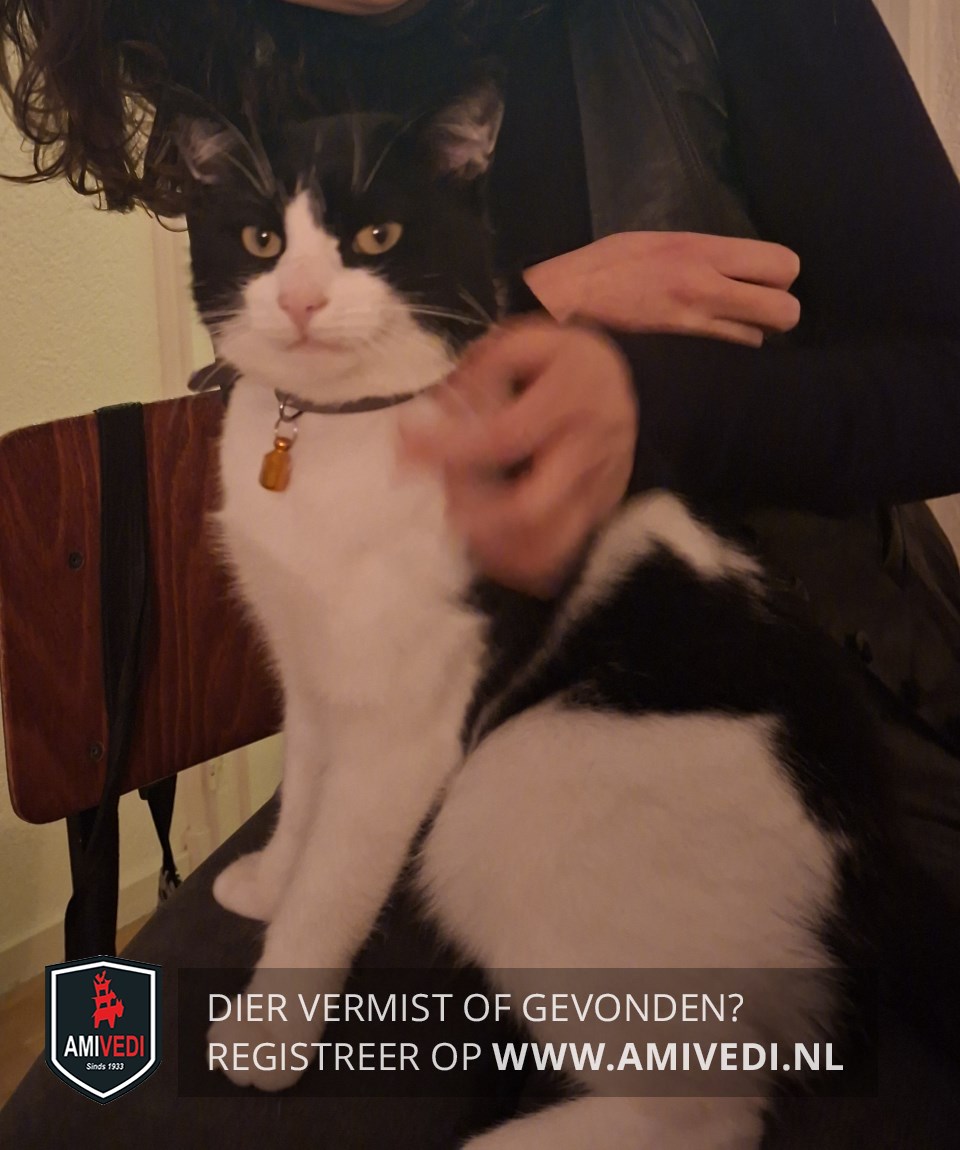 | Signalement | Wit/zwarte kater. Zwart op het kopje dat doorloopt over en langs de oogjes, verder wit snuitje, roze neuspunt. Witte keel/borst, buik en flanken. Zwart gevlekt dek over de rug. Op zijn rug heeft hij 2 plekken die wat kaler zijn. Zwarte staart. Grijze halsband met een goudkleurige hanger. |