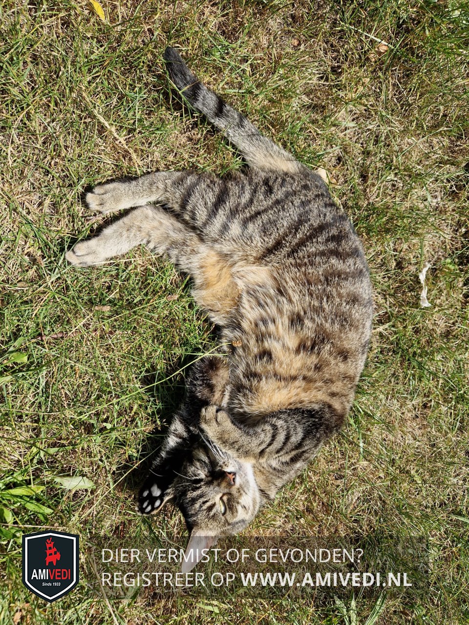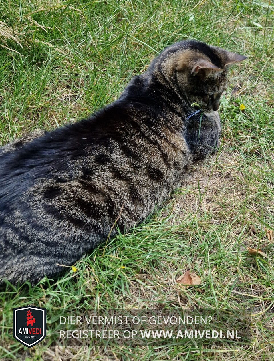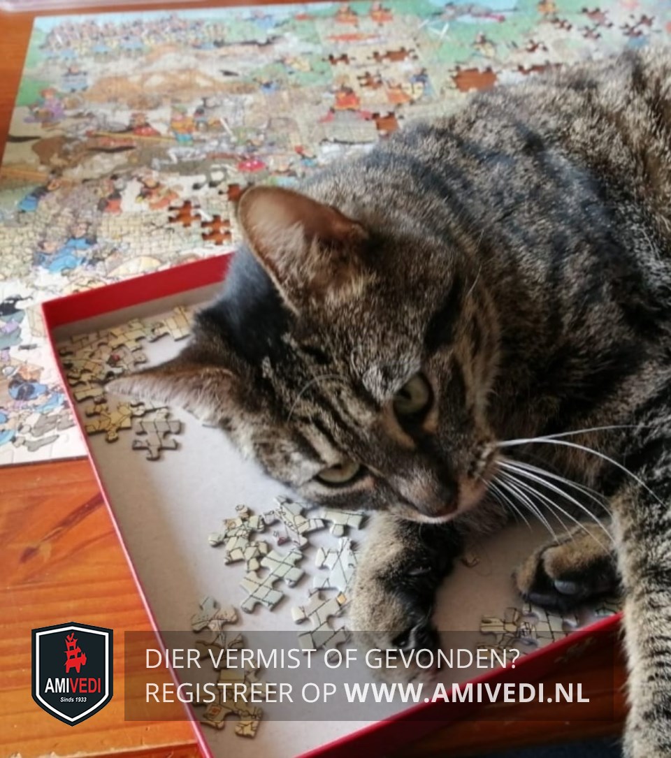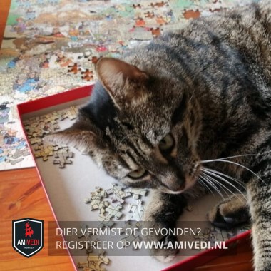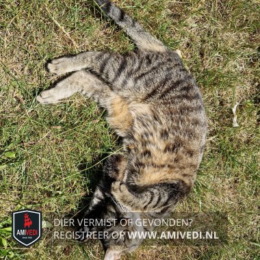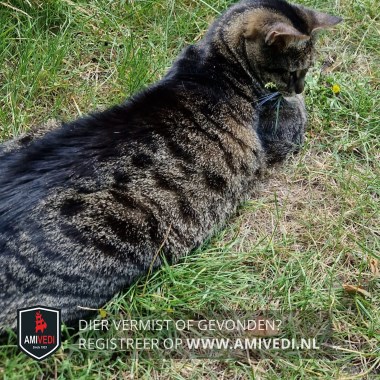 | Signalement | Europese korthaar poes, bruin/zwart gestreept. Licht bruin gemêleerd op haar buik. Brede zwarte streep vanaf kopje over haar rug. Onderkant voetjes zwart met zwarte voetzooltjes. Draagt een oranje halsband met zwart en witte stippen. |
