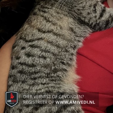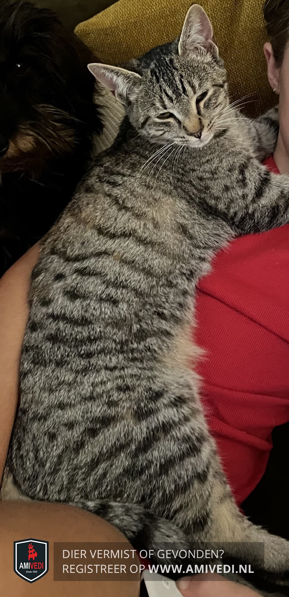 | Signalement | Geheel cypers bruin-zwart gestreepte poes. 3 weken geleden gesteriliseerd, daardoor haar nog niet volledig terug en nog hechtingen. |