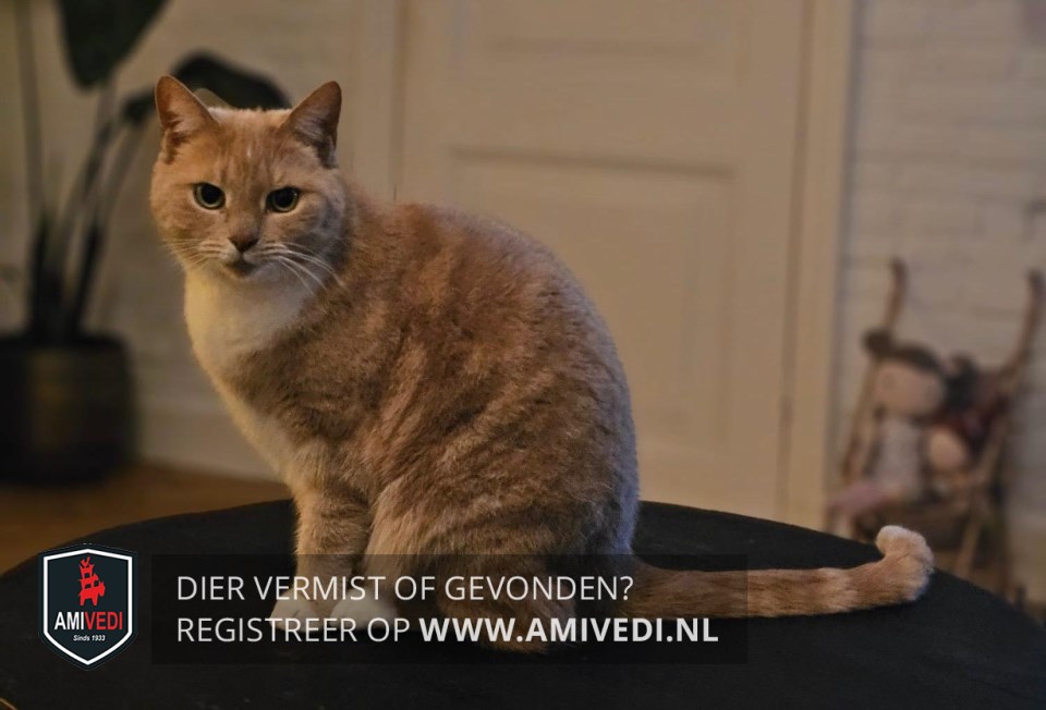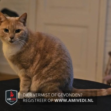 | Signalement | Roodoranje poes. Rood/oranje kopje, met klein wit vlekje op de bles. Wat lichter rondom de snuit. Witte kin, bef en borst. Wit voetje linksvoor en linksachter. Ziek (braken) van huis gegaan. |