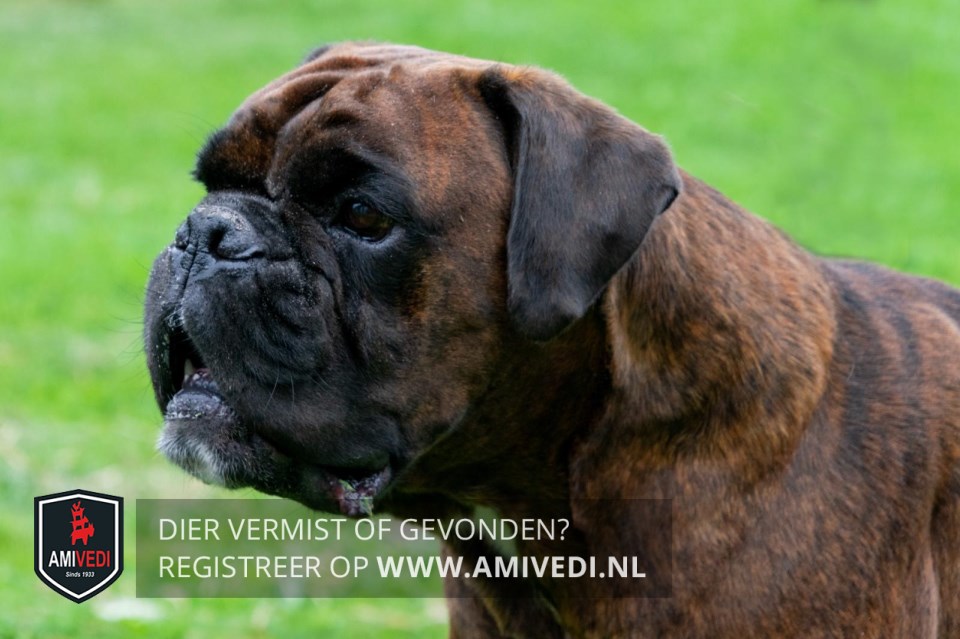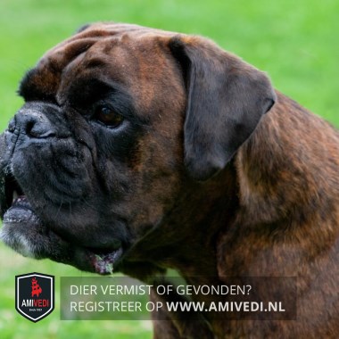 | Signalement | Bruin-zwart gemêleerd met zwarte snuit en oren. |