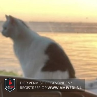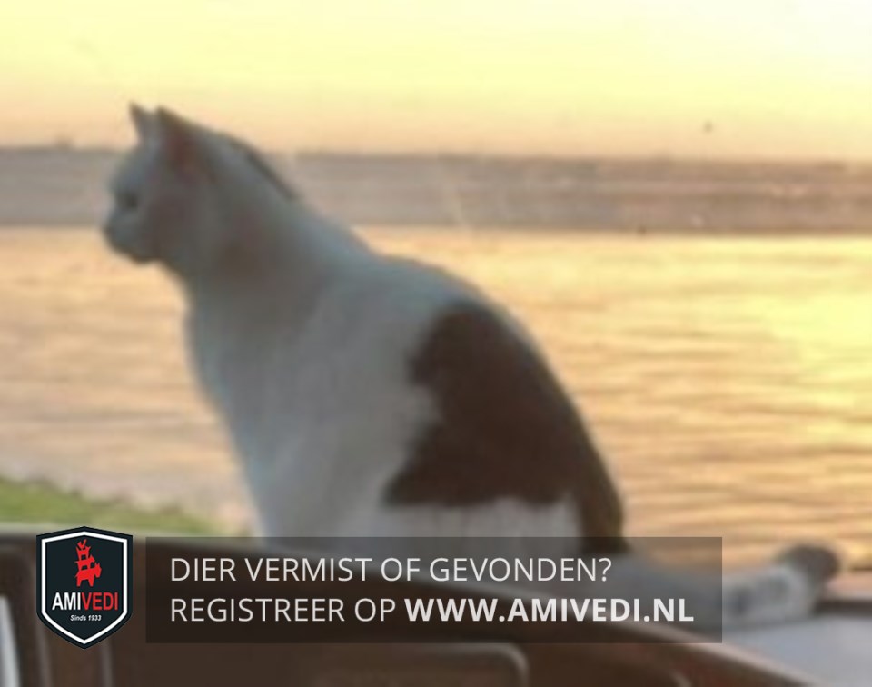 | Signalement | Witte poes. Achter op de kop een zwarte plek. Linkerzijkant en rug een grote zwarte plek. Puntje van de staart zwart. Schuw. |