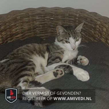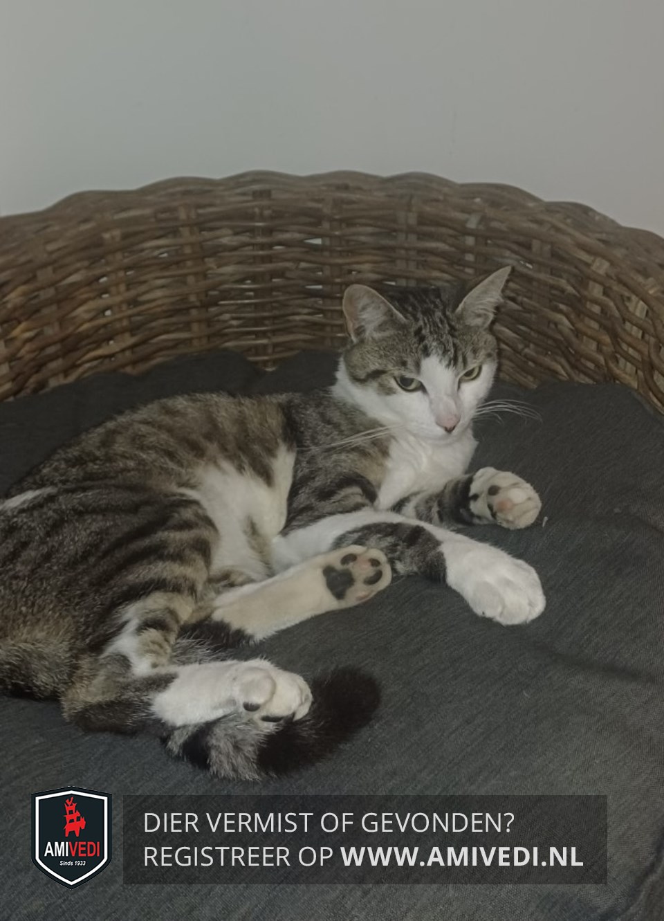 | Signalement | Grijs/zwart gestreept op de kop tot de ogen, witte snoet, kin borst, buik en poten. Grijs/zwart gestreepte rug en staart. Grijs/zwarte vlekken op de achterkant van de voorpoten en op de hakken. Vermist vanuit Maasmechelen. |