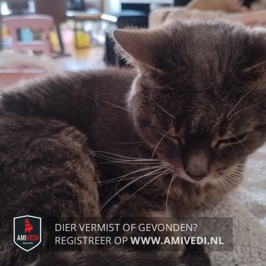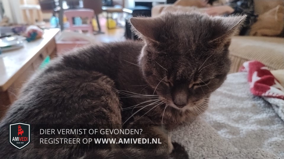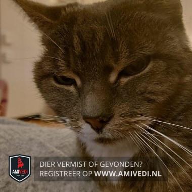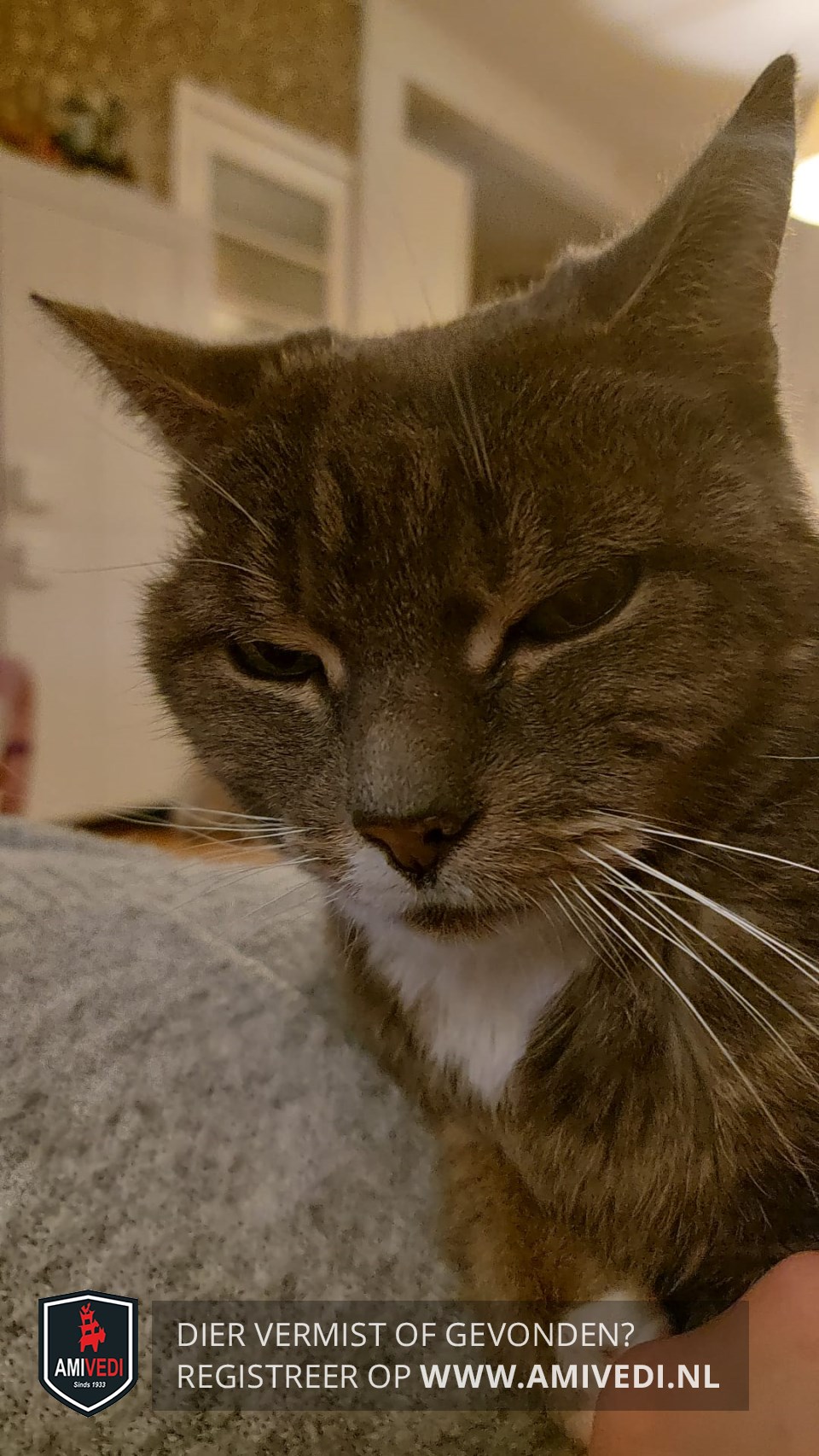 | Signalement | Cypers grijs. Wit vlekje rechts van de neus. Witte bef. Witte voetjes. Ze hoort en ziet niet meer zo goed. |