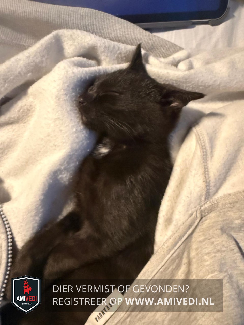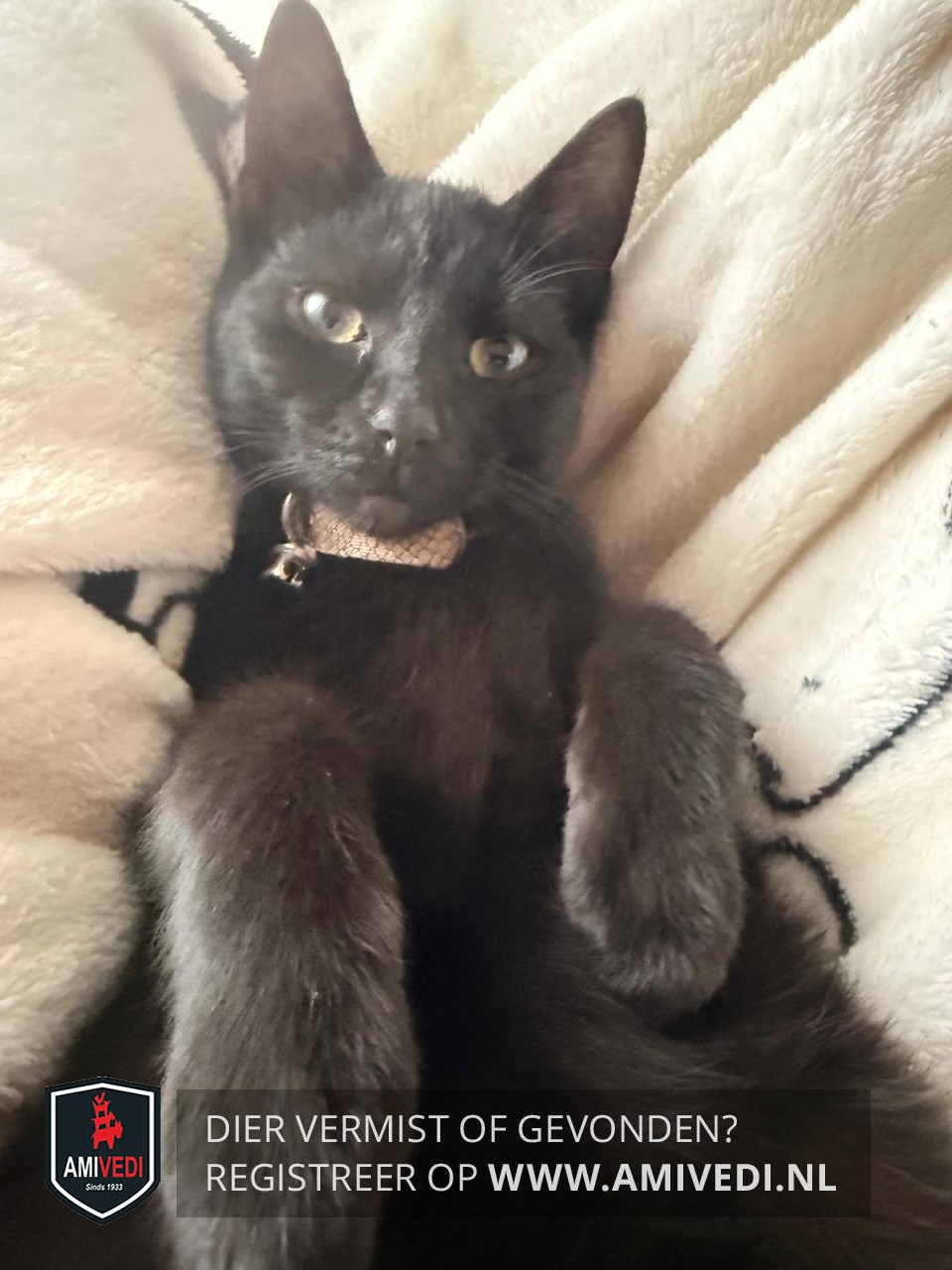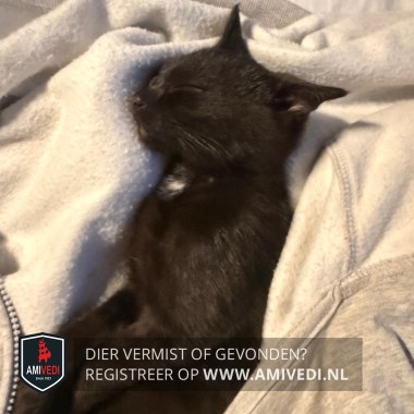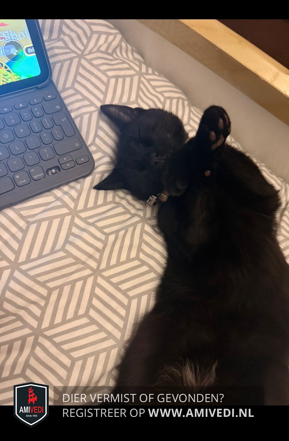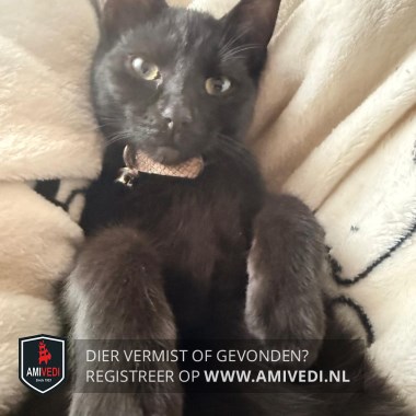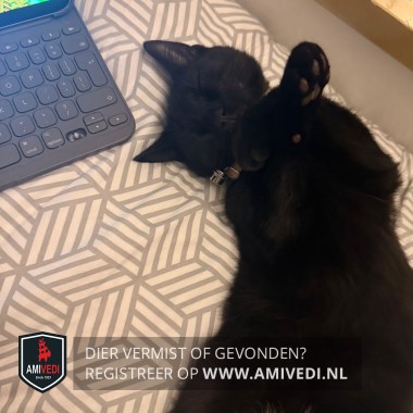 | Signalement | Helemaal zwart met klein wit vlekje op de bef. Wat wit op de buik. draagt een roze-goude halsband. |