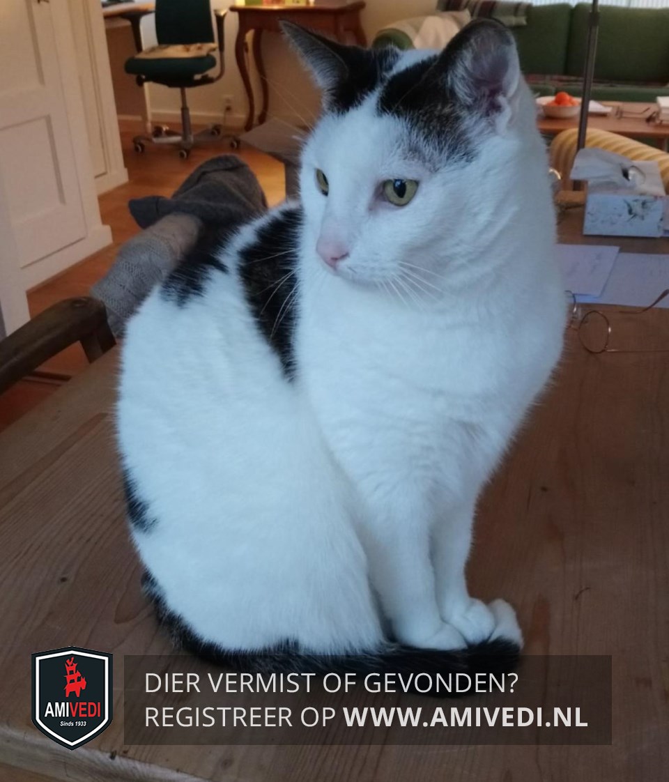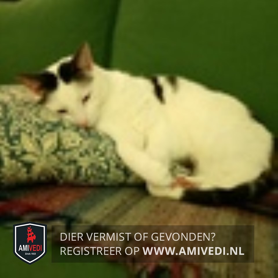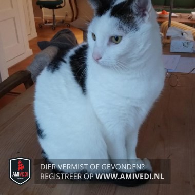 | Signalement | Wit/zwart gevlekte kat. Hij heeft twee zwarte oren. Grote, zwarte vlekken op zijn rug. Zwarte staart met een witte punt. |