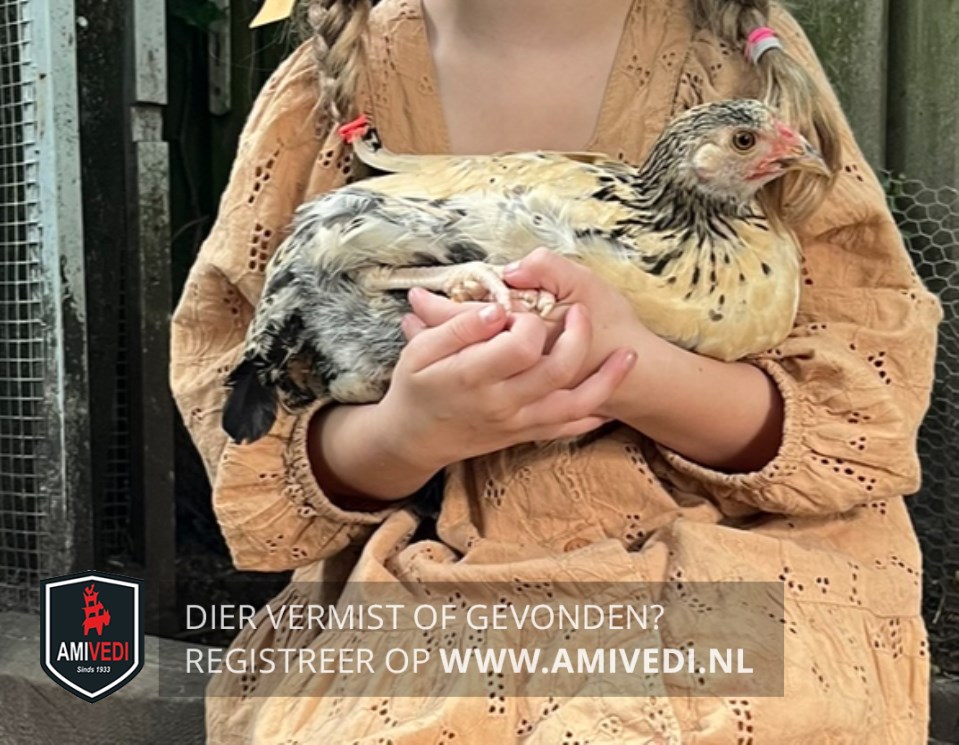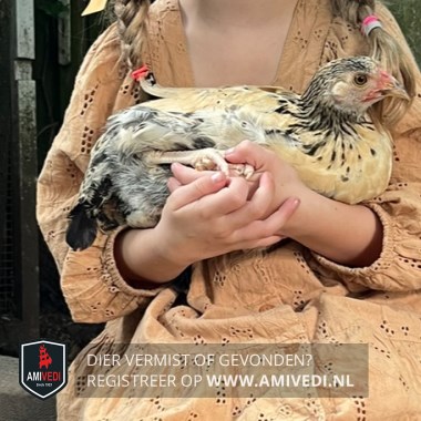 | Signalement | Beige met witte Wyandotte mix. Zwart gespikkeld kopje en nek. Beige bovendek. Achterkant is beige met zwart gemêleerd. Zwarte staart. |