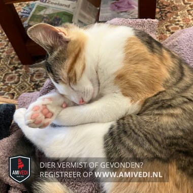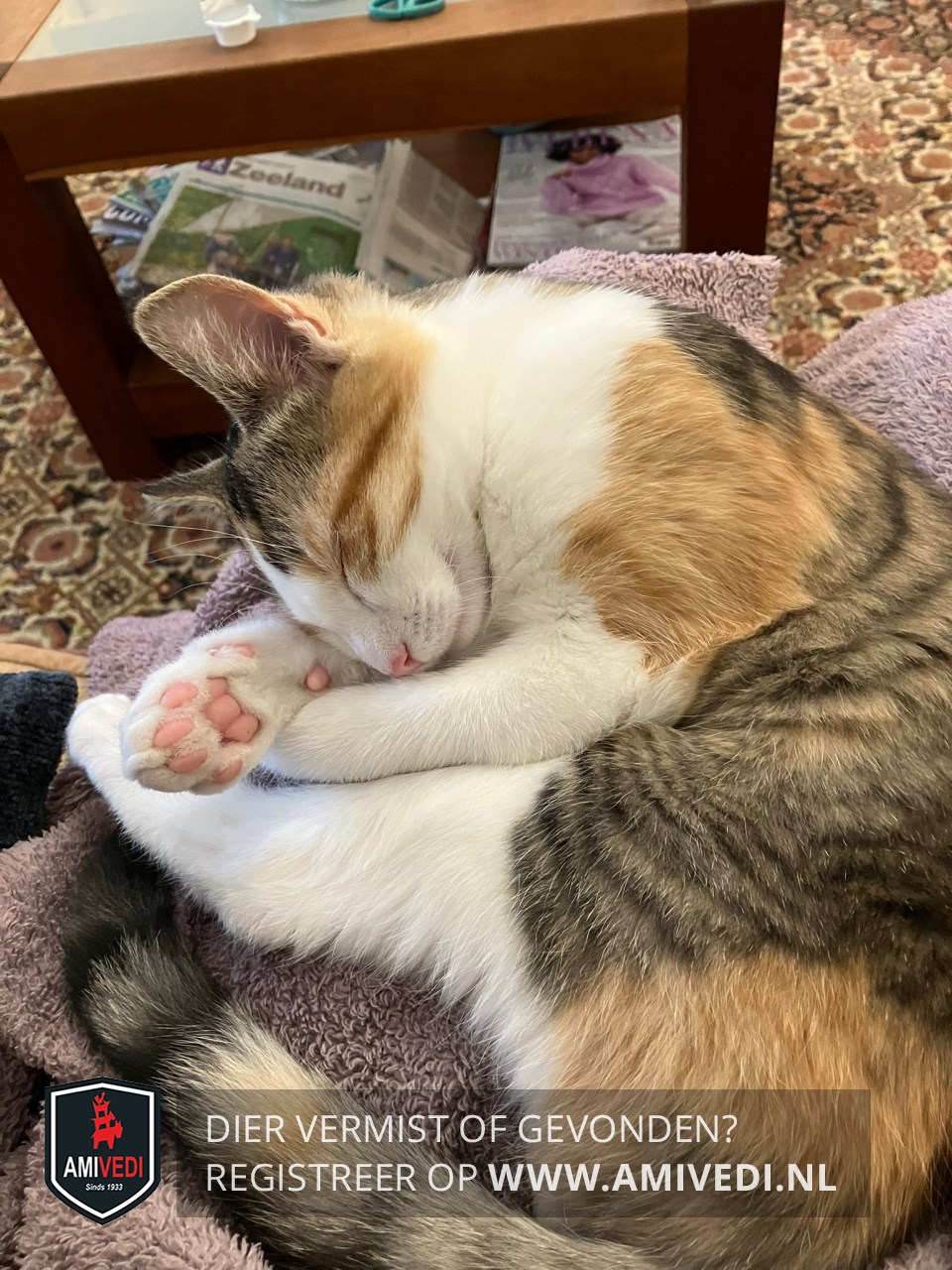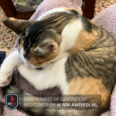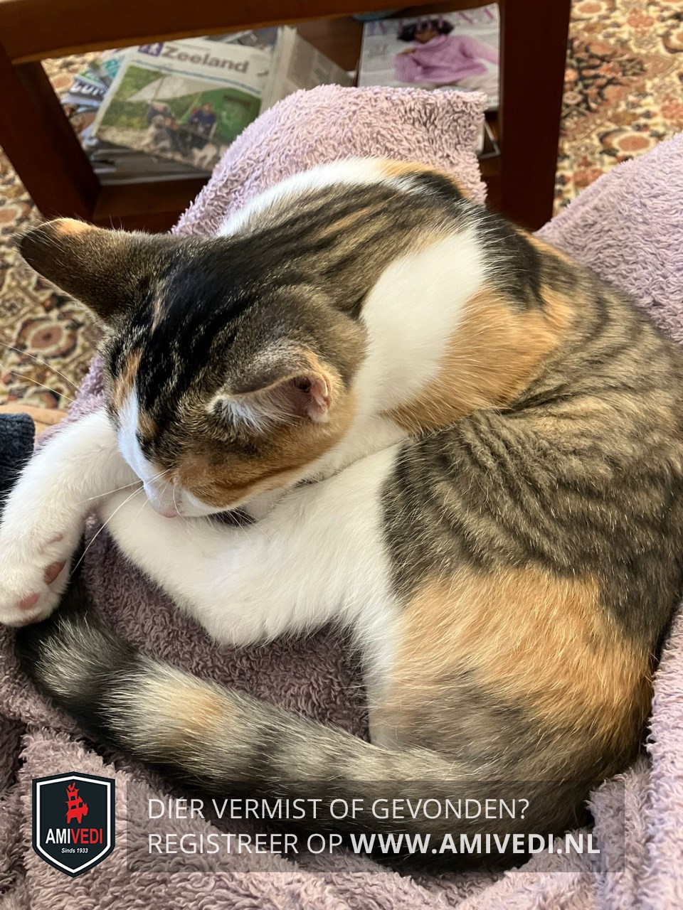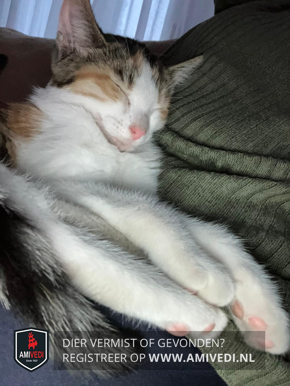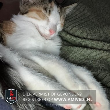 | Signalement | Lapjeskat, witte snuit en tussen de ogen. Witte pootjes. Bovenop hoofd zwart - bruin gestreept. Oranje vlek boven linkervoorpoot en links boven staart. Oranje vlekken naast ogen, met donkere strepen. |